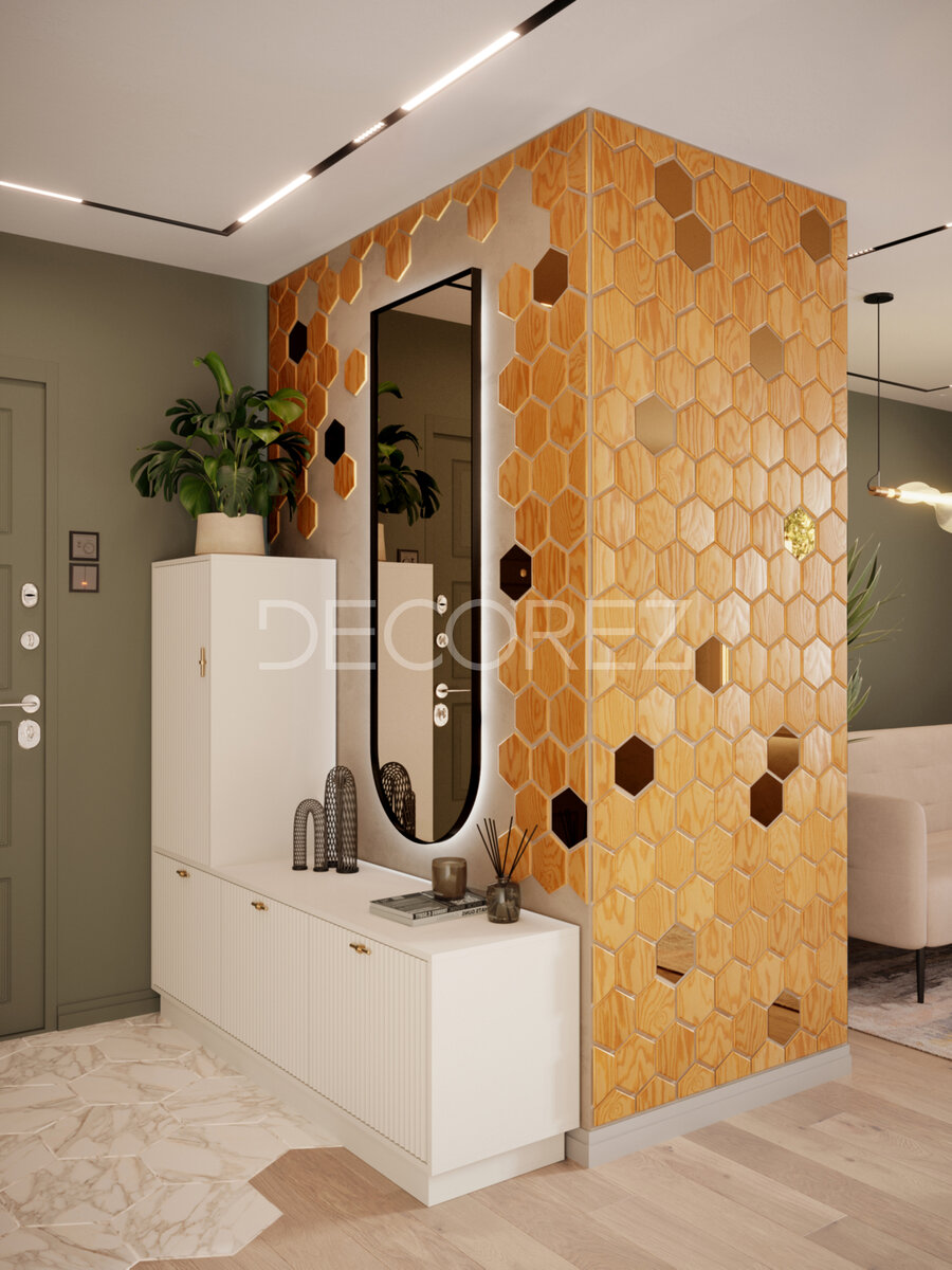 Новый тренд, который задала компания DECOREZ набирает обороты. Всё новые и новые решения прилетают от сибирской компании прямиком в ваши дома Новый, эффектный и доступный способ преобразить стены всего за несколько часов теперь доступен каждому Представляем вашему вниманию гексагон или проще говоря деревянные шестигранники из натурального дерева, меняющие пространство вокруг Изделие, что видите на фото выполнено из сибирской сосны, покрыто лаком и не имеет дополнительных оттенков. Натуральное дерево, покрытое лаком. Минималистично и качественно. Деревянные изделия оживляют пространство. А имеющиеся в коробке несколько зеркальных, золотых плиток добавляют интерьеру из гексагона невероятный шарм и эстетику, смешанную с лёгкой абстракцией. Есть ещё много вариаций цветов в т.ч доступен гексагон без покрытия лаком в натуральном цвете, т.е фактически вы получаете чистую деревянную плитку, чтобы вы сами могли подобрать необходимый оттенок под свой интерьер и самостоятельно покрасили шестигра