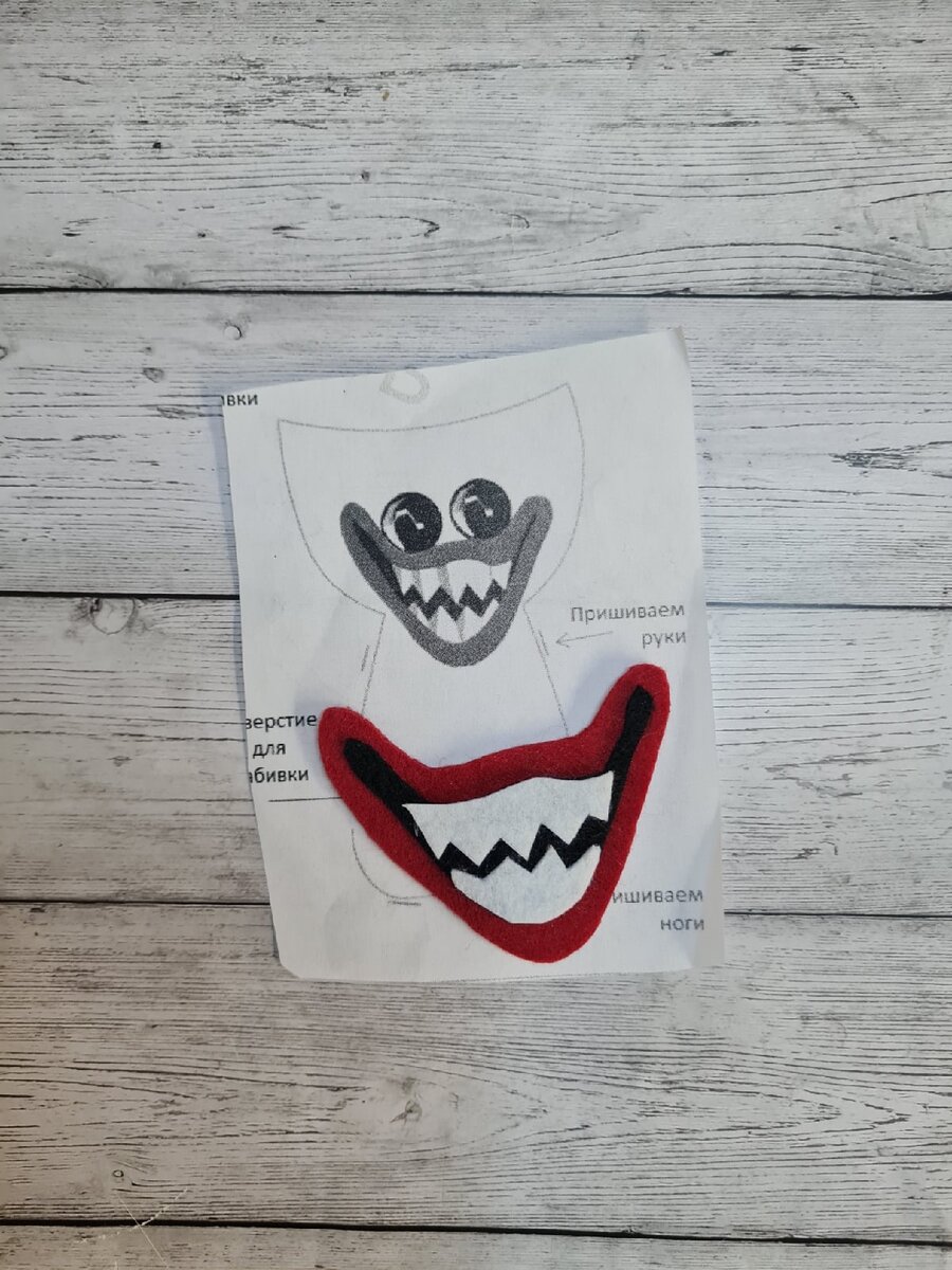 Привет, мои хорошие! Сегодняшней статьей завершаем пошив Хагги Вагги. Читаем внимательно, и все будет хорошо - я узнавала. 😉 Выкройку рисовала обычной гелиевой ручкой по изнанке флиса. Первая часть вместе с выкройкой находится чуть ниже. Что шьем, какими материалами, почему. Это туда. После того, как мы с вами собрали все материалы, выкроили игрушку, нужно начать собирать этот монстрячий пазл. Первым делом я склеила фетровый рот с зубами. Если глаза у вас по выкройке, то заготовьте и их. Или же удостоверьтесь, что никакой кот не укатил у вас пластиковые глаза, как это было у меня. 😅 ВАЖНО: я использовала специальный текстильный клей фирмы Гуттерман, так же можно использовать клей Момент Кристалл. Рот и глаза откладываем и забываем до финала. Если бы мы пришивали рот, а не клеили, то конечно сначала необходимо было бы его пришить к детальке лица. Но мы будем клеить, чтобы не усложнять себе жить. Не стоит пытаться приклеить его сразу же, до прошивания туловища - будет сложно выворачива