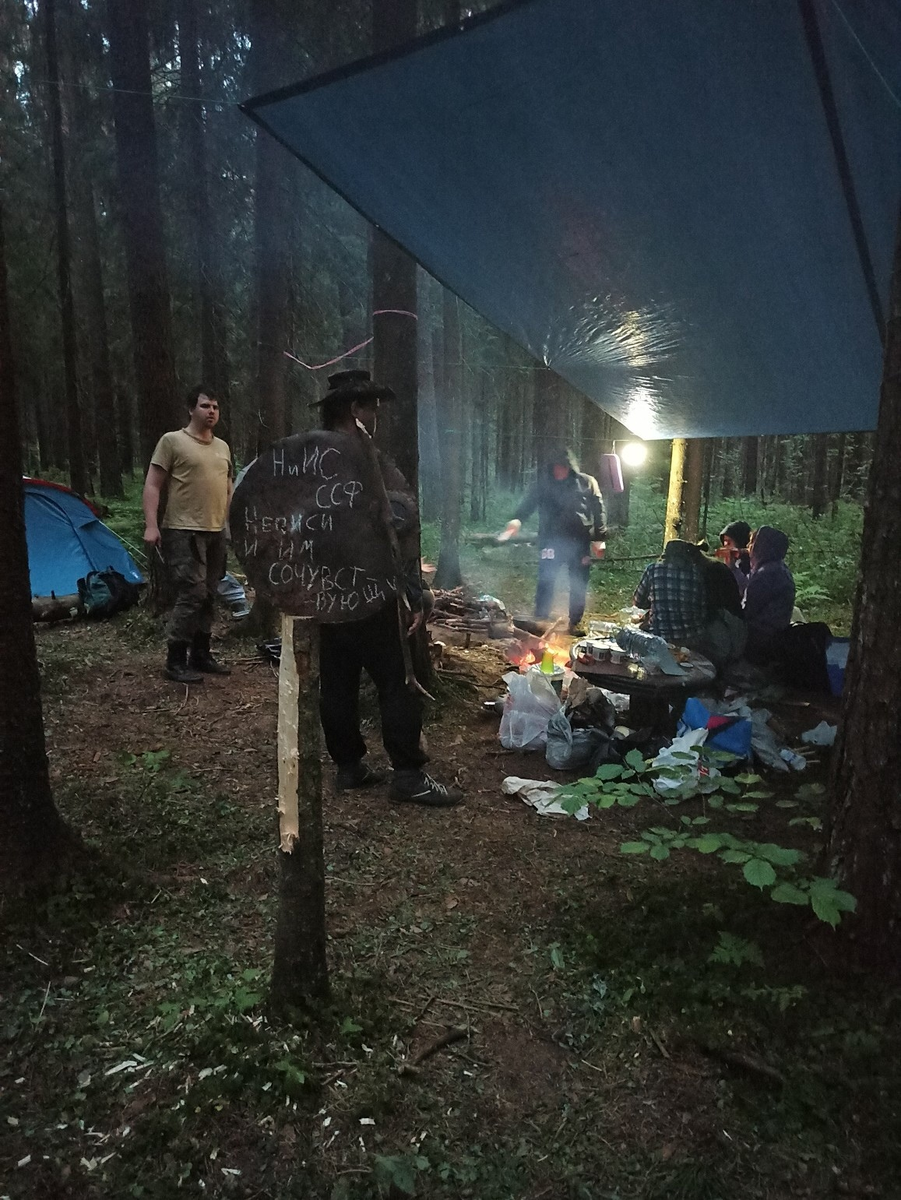 Вот из леса к нам вышел какой то довольно цивильный парень, настолько цивильный, что мы даже не смогли подобрать ему прозвище, а имя его никто (в смысле я) не запомнил. Он весь вечер пил минералку из бутылки и только когда он уронил наш импровизированный стол, всё что на нём и себя, мы узнали, что в бутылке у него была вовсе не минералка. Тогда мы прозвали его Магистром Столоверчения и поскольку я не хочу писать такое длинное прозвище несколько раз, больше он в этой истории не появиться. Вот из леса к нам вышел чел (Как видит