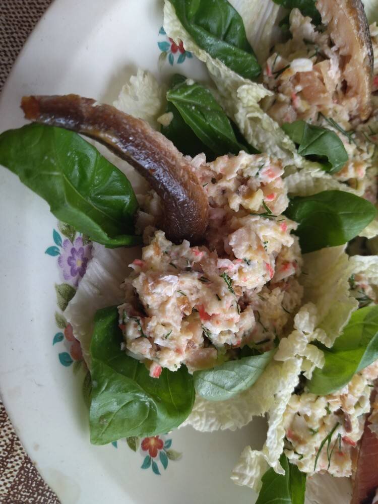 #кукпадготовит в #четверг Приготовим #вместе подсказанный жителями восточного города Находка, салат с рыбой, огурчиками и свежей зеленью. Ещё с рыбной недели припасена баночка вкуснейшей ряпушки, но её место может занять, полагаю, скумбрия, шпроты или иная готовая рыбка. Подача вполне может украсить даже праздничный стол. Ингредиенты: консервированной рыбы в масле, пекинская капуста , небольшой огурец, маленьких картофелины, крабового мяса, зелёный базилик, укроп и зелёный лук, сметаны и майонеза, соль Способ приготовления: Отварить почищенную картошку и ещё теплую потереть на средней тёрке. На такой же тёрке потереть крабовое мясо, очищенный огурец, смешать с майонезом и сметаной, посолить по вкусу. 2/3 рыбы порезать крупно. Оставшуюся - длинными полосками для оформления. Отделить листья капусты, обрезать верхние чашечки. Укропа и зелёного лука порезать немного, по вкусу. Зелень добавить к рыбе и заправить натёртой массой. Разложить салат на листья. Оформить базиликом и рыбой.