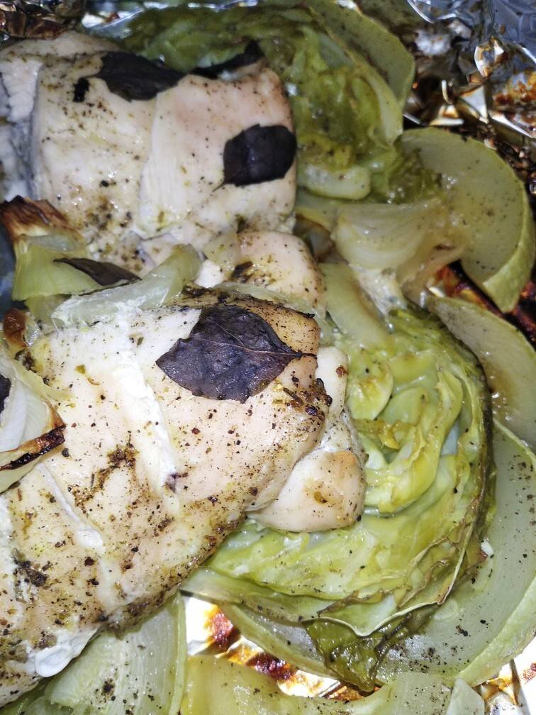 #страви Ингредиенты: шматочки філе, капусти, кабачка, цибулинки, Базилік, Оливкова олія для поливання, Сіль, перець, улюблені спеції, Фольга Способ приготовления: Молоду капусту порізати на стейки по 1 см. Філе порізати ножем навхрест, посолити, поперчити, полити оливковою олією, гарно промасажувати. Викласти зверху на капусту. Далі викласти порізану цибулю кільцями, базилік цілі листочки. Це все виклалати на деко, вистелене фольгою. Далі зверху все ще раз злегка посипати спеціями і полити оливковою олією. В ідеалі ще потрібно кілька різнокольорових солодких перців, але у мене не було. Закрити фольгою і поставити випікатися на 40 хв. При температурі 180-200 градусів. Тоді відкрити страву і запекти до ніжного золотистого кольору. Капуста виходить неймовірно смачною, мені найсмачніша з усього. Хоча решта також смачно.