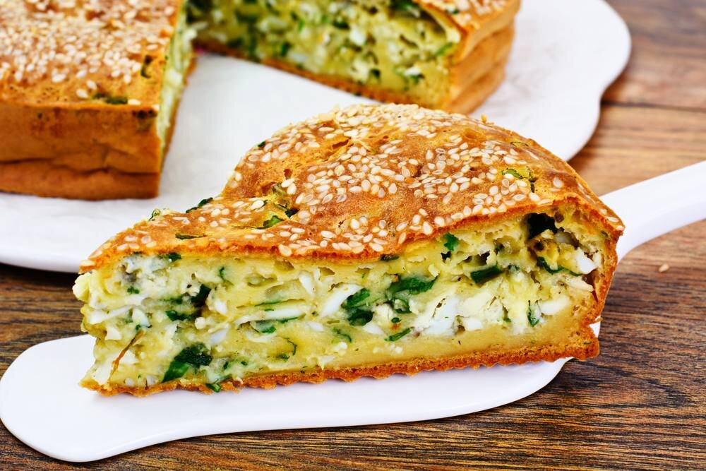 0.5 ч.л. разрыхлителя Яйца отварить, порезать мелко. Также режем лук. Сыр нужно потереть на терке и все хорошо перемешать. Добавить сметану и лук. Начинку отложить. Яйца смешать со сметаной, добавить муку и разрыхлитель. Форму смазать растительным маслом, вылить половину теста. Положить начинку. Далее остальную половину теста. Сверху посыпать кунжутом. Выпекать 20-30 минут при температуре 180 градусов.