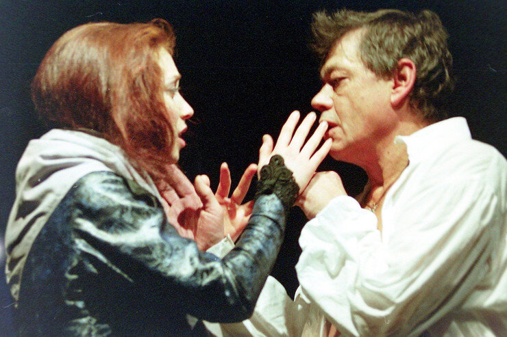 Дело в том, что я тогда вообще была девочка из интеллигентной семьи, я слова матёрного не говорила… Когда мы репетировали в Еврейском Центре, на репетицию пришёл Володя Сорокин. И первое, что нам сказал: «Ребята, вся нецензурная лексика, которая была где-то чуть-чуть прописана, это совершенно не обязательно, это просто было сделано для перевода, для немцев, чтобы немножко усилить эмоциональную окраску», и так далее… Сказали: «Хорошо». А у меня в паре была Оксана Фандера… Андрей Смоляков с начала репетиции, потом подключился Володя Скворцов, то есть, была изумительная совершенно компания. И такая небольшая комната, в которой мы репетируем, и Эдуард говорит: «Давайте, давайте…». Пунцового цвета становлюсь и от зажима я вдруг выдаю не то, что там без мата, а я выдаю в 48 раз больше, чем написано. Ну, они сидели на полу, слушали, там уже просто… Они рыдали, они ползали, вот так вот всё… А я, не выключаясь, на такой драматический монолог, и всё вот это вот, на разрыв аорты прямо, "ух!". И заканчиваю… «О, молодец!». И самое страшное, что эти шлюзы до сих пор не закрылись! (Смеётся)