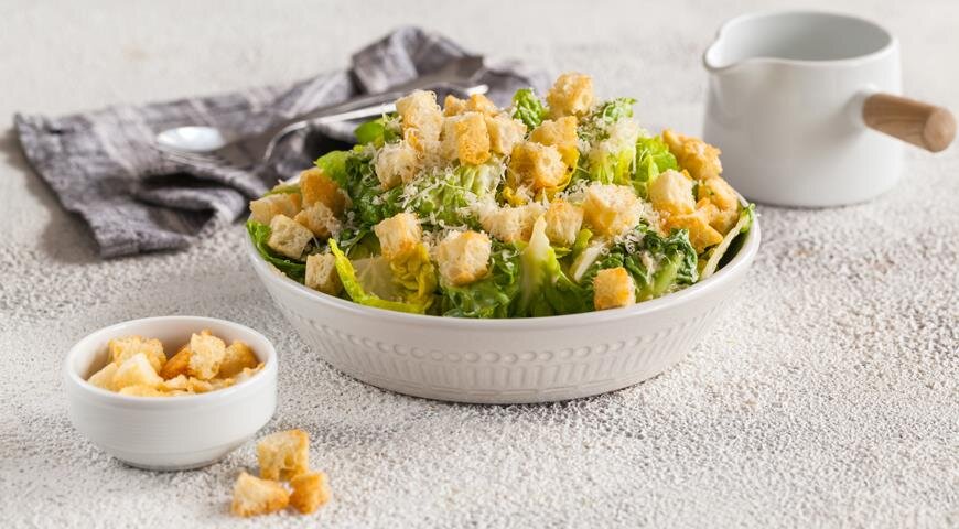 Французы как в воду глядели, утверждая, что из ничего можно сделать три вещи: скандал, шляпку и салат. Именно "из ничего" и появилось на свет салат Цезарь ныне столь популярное блюдо. Вряд ли автор этого салата, американский повар итальянского происхождения Цезарь Кардини, мог предположить, что его произведение будет столь знаменитым во всем мире. Легенда гласит, что у повара закончились почти все продукты именно тогда, когда в его ресторан нагрянула большая и шумная компания киношников из Голливуда. Предприимчивый итальянец собрал все, что оставалось, и... вошел в историю всемирной кулинарии. А оставалось у него и правда немного: листовой салат, чесночные крутоны, оливковое масло, яйца, пармезан и вустерский соус. Поскольку современные рестораны недостатка в продуктах не испытывают, появилась масса вариантов салата Цезарь. Его автор, Цезарь Кардини, вряд ли бы обиделся на это. Ведь первым, кто начал модифицировать этот салат, был его родной брат. ИНГРЕДИЕНТЫ ПОШАГОВЫЙ РЕЦЕПТ ПРИГОТОВЛ