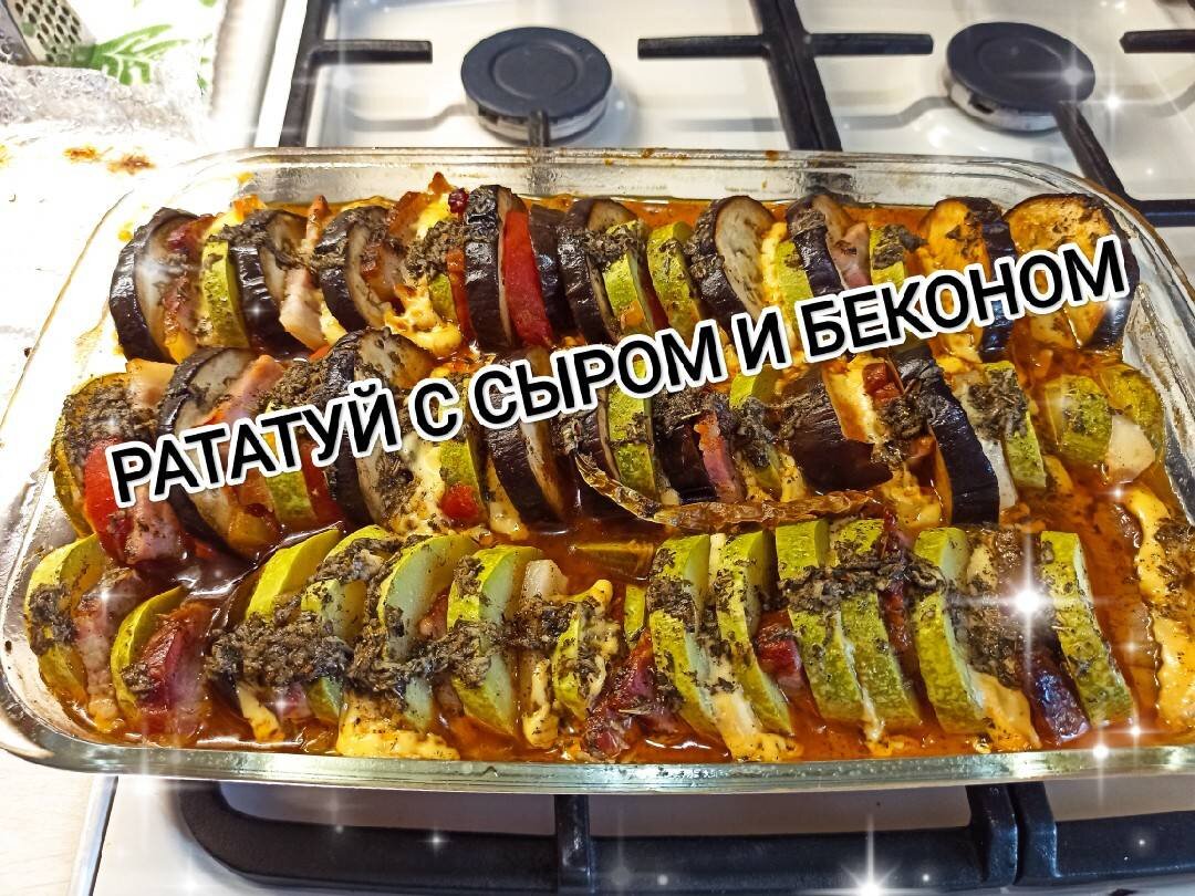 Рататуй с сыром и беконом 🧀🥩 Сезон овощей в самом разгаре. Осталось только чуть-чуть добавить фантазии и будет сытное блюдо 👍😁 #среда Ингредиенты: кабачка 🥒, баклажан 🍆, помидора 🍅, сладких перца, крупная луковица, бекона/грудинки, сыра, чеснока, зелени, Соус для заливки, Чеснока, Масло оливковое, Прованские травы по вкусу, Перец чёрный Способ приготовления: Начнём с заготовки нарезки. Сыр и бекон нарезать крупными кусками. Лук нарезать кубиками и пассеровать на постном масле. Помидоры бланшируем и нарезаем кубиками. Отправляем помидоры к луку. Тушим минут 5. Перец предварительно запечь в духовке. Снять кожицу и нарезать кубиками. Добавить к помидорам. Тушить ещё 20-25 минут. Это основа для рататуя. Кабачки и баклажан нарезать крупно, по 0,5-0, 7 мм. В форму налить соус. Сверху выкладывать чередуя овощи и сыр с беконом. Чеснок натереть, смешать с пряностями и маслом. Хорошо взбить, чтобы масса объединилась между собой. Залить сверху овощи. Ставим в духовку на полтора/два часа. З