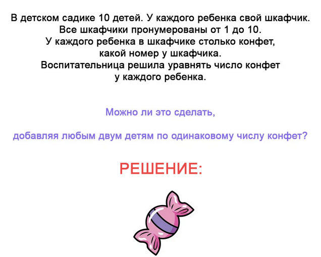 Конечно у воспитательницы не получится уравнять число конфет у каждого ребенка, если она будет действовать таким способом. Разбираемся почему. Изначально суммарное число конфет в шкафчиках равно 55 (1+2+3+4+5+6+7+8+9+10). Предположим, что у воспитателя мешок с нескончаемым числом конфет, и добавлять она может сколько угодно. Только по условию за одно свое действие она добавляет конфеты двум детям одновременно, а значит добавляет она N+N=2N конфет. Т.е. каждый раз прибавляется четное число конфет. Если складывать нечетное число с четным числом конфет, то всегда будет получаться нечетное число конфет, которое невозможно разделить на четное количество детей нацело. СПАСИБО ВСЕМ ЗА УЧАСТИЕ В ОБСУЖДЕНИЯХ РЕШЕНИЙ ежедневных заданий 🧡