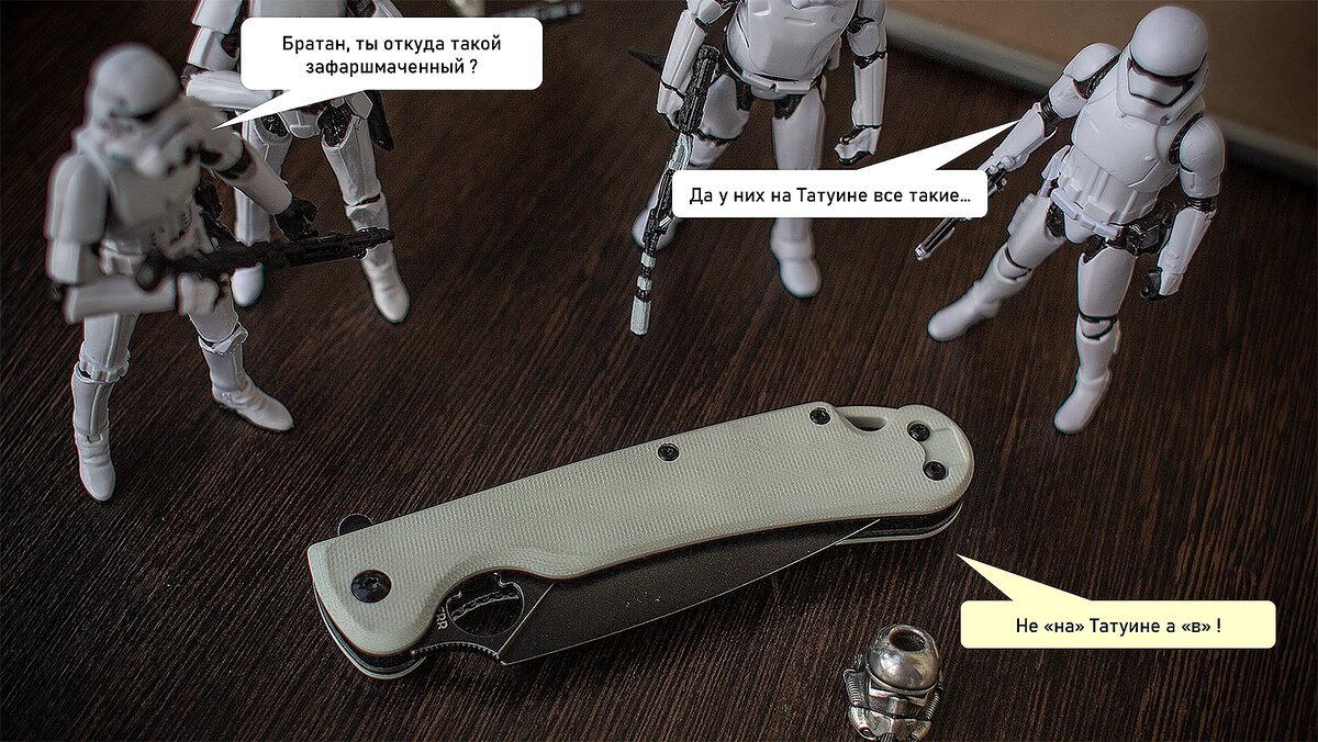 Ну что сказать. Я ярый поклонник Звездных Войн и не мог пройти мимо, не поддержать Российского производителя DAGGERR Knives. У них вышла лимитка DAGGERR Arrow - Stormtrooper- белая с черным - все по канону... НО НЕТ. Из коробки нож грязный, залапанный- я пересмотрел их пять и выбрал самый чистый. Уважаемые DAGGERR Knives, ребят, я, конечно, понимаю, что вы косячили всегда, НО продавая кипельно-белую полочную ЛИМИТКУ совать ее ГРЯЗНОЙ и ЗАЛАПАННОЙ в коробки – это очередная беда. Мы пережили провал первого Урбана, косяки второго, унылую сборку Sting и Biggerr и Pelican . НО то что вы делаете сегодня - это как испортить подачу блюда, как в место аккуратно скрученного рола в японском ресторане подать кашу и сказать ну вот – жрите на все деньги. Нож сам по себе весьма не плох, клин по центру, накладки в размер лайнеров (УРА!), снятые фаски, механика НАКОНЕЦ работает как должно, к заточке почти претензий нет. НО сам нож просто надо мыть. Я предыдущий "пеликан" купил в 2019 за 3200 ₽ и к е