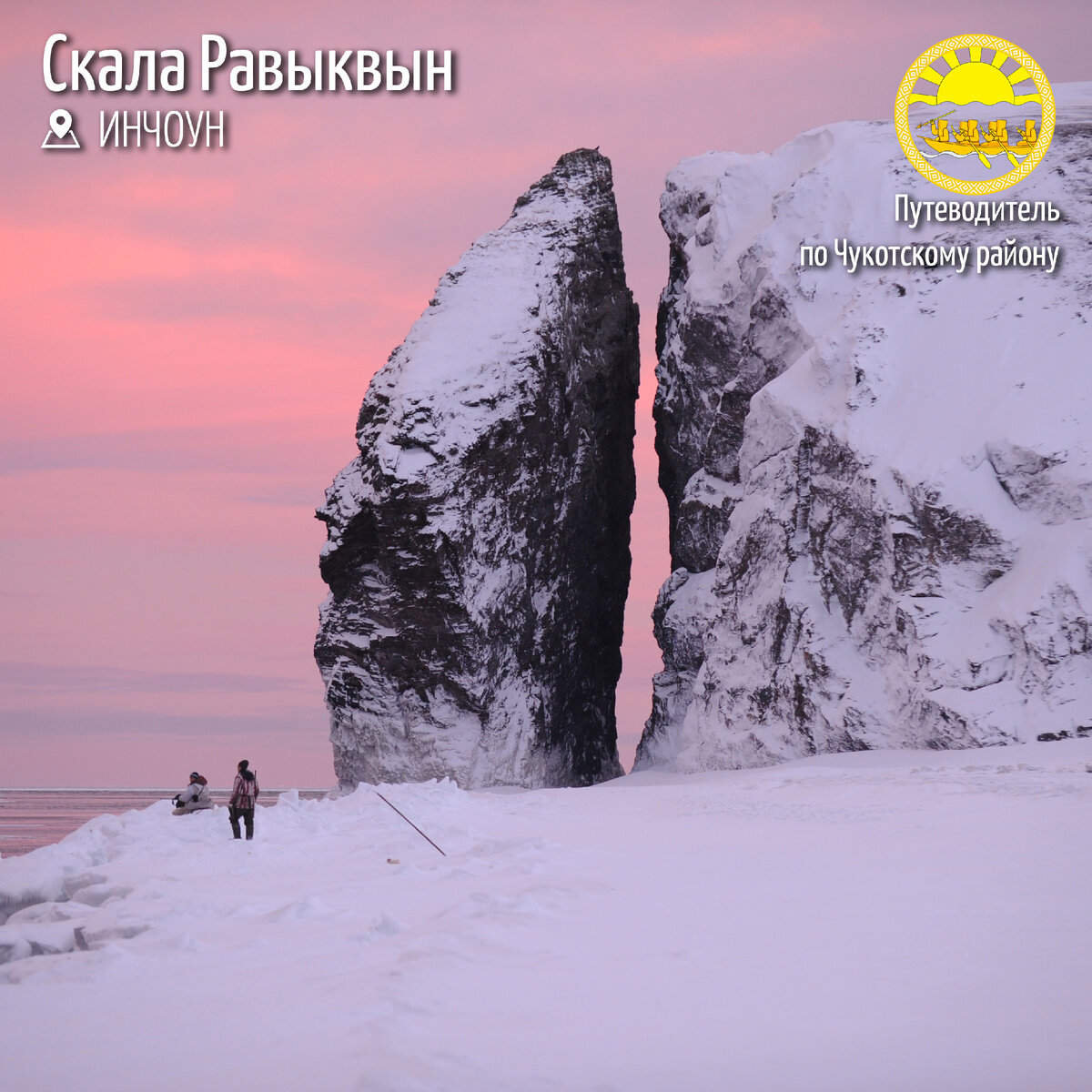 Пожалуй, одно из самых фотогеничных мест Чукотского района (если не самое фотогеничное) – это скала Равыквын, находящаяся около села Инчоун. Инчоун удивительное место, вот смотрите: село находится всего в 27 километрах от Уэлена, что делает его вторым самым восточным населённым пунктом нашей страны; в Инчоуне есть улица Морзверобоев - единственная в России улица с таким названием! Кстати, а вот наше видео с лучшими видами села зимой Чуть восточнее села Инчоун, отделившиеся от обрывистого берега, находится инчоунская скала Равыквын (скала – богатырь). На сопке возле скалы издревле и до сих пор находится место, которое у морских охотников называется «место для наблюдения». За скалой находится одно из самых крупнейших лежбищ моржей на Чукотке. Моржи залегают там с конца июля – начала августа и находятся там до глубокой осени. Лежбище моржей почитается местными и считается священным. Жители села Инчоун почитают традиции своих предков родов Кэнэнэв и Волькыт, которые связаны с морским про