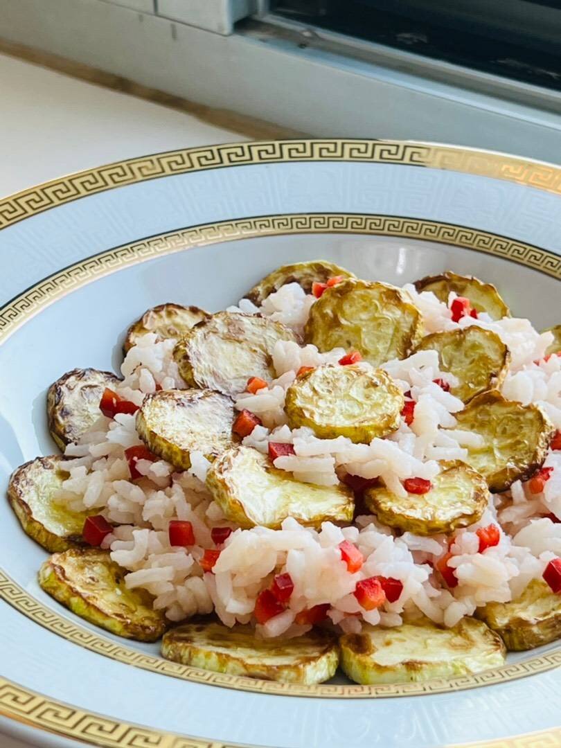 Ингредиенты: кабачки, красный болгарский перец, варёный рис 🍚