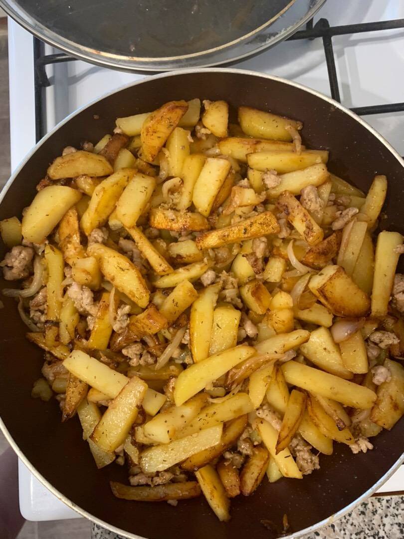 Ингредиенты: картофеля, репчатого лука, фарш домашний, чеснока, соль, перец, специи Способ приготовления: Я брала две сковороды. На одной обжариваем на растительном масле лук до золотистой корочки, затем добавляем фарш, посыпаем солью перцем и готовим до конечного состояния. Далее чистим, нарезаем картофель, обсушиваем его и перекладываем на вторую раскаленную маслом сковороду. Придерживаемся технологии жарки(обжариваем 5 минут переворачиваем, через 7 минут переворачиваем ещё раз жарим на высоком огне, затем убавляем газ на средний обжариваем ещё 7-10 минут, добавляем фарш с луком перемешиваем и под крышку на 5 минут, добавляем чеснок нарубленный перемешиваем, прибавляем высокий газ и жарим ещё 5 минут). Готово).