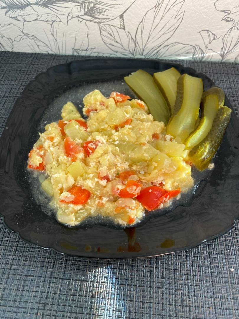 Ингредиенты: Кабачки (у меня вышло 2 крупных), Лук репчатый, Помидор, Перец болгарский, Сметана , Чеснока, Масло растительное, Соль, специи, Яйцо Способ приготовления: Вымыть кабачки и очистит от кожуры. У болгарского перца удалить семена и перегородки. Нарезаем кабачок, перец, помидор кубиками, сильно не мельчим. Мелко нарежьте репчатый лук, затем обжарьте его с растительным маслом на малом огне в кастрюле с толстым дном. Обжаривайте лук на медленном огне, под крышкой, до тех пор, пока он смягчится и станет полупрозрачным. Добавьте в кастрюлю нарезанные кабачки и перемешайте, накройте крышкой и готовьте 15 минут. При этом не нужна вода – овощи содержат достаточное количество сока. Через указанное время добавьте в кастрюлю перец, помидор. Аккуратно перемешайте. Продолжайте готовить, теперь уже без крышки, около 10 минут. Добавляем сметану. В отдельной тарелочке взбить яйцо вилкой и струйкой вливаем, перемешиваем. Должно получиться как паутинка. По вкусу добавляем соль(приправу), перец.