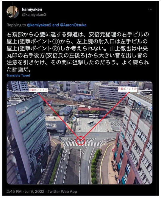 Хотя основные СМИ приняли эту фантастическую историю, японской полиции и аппарату безопасности не удалось подавить альтернативные интерпретации. Блоггер Такаши Китагава разместил 10 июля материалы, которые предполагали, что в Абэ стреляли спереди, а не сзади, где стоял Ямагами и что выстрелы должны были быть сделаны под углом с вершины одного или обоих высоких зданий по обе стороны перекрестка напротив привокзальной площади.