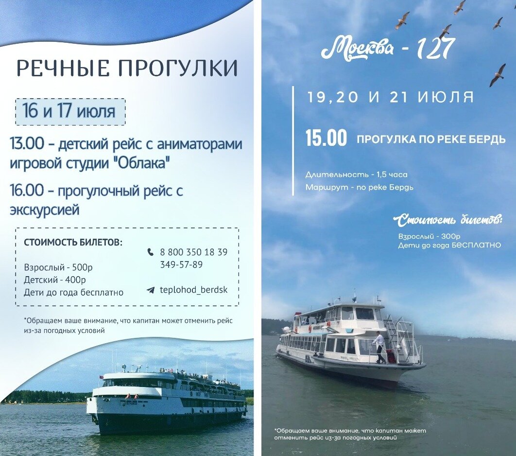 Мы рады сообщить Вам прекрасную новость! В Бердске теплоходные прогулки с причала на набережной ул. Попова теперь доступны на двух теплоходах – «Виктор Гашков» и «Москва-127». В будни можно отправиться на прогулку на теплоходе «Москва-127» по реке Бердь. В выходные – на теплоходе «Виктор Гашков» по Обскому водохранилищу. Рейсы в расписание включаются в зависимости от погодных условий, поэтому настоятельно рекомендуем звонить и уточнять отправление, или следить за актуальной информацией в нашем телеграм-канале https://t.me/teplohod_berdsk Расписание прогулок на теплоходах «Виктор Гашков» и «Москва-127» в Бердске с 16 по 24 июля 16 июля теплоход «Виктор Гашков» В 13.00 до 15.00 на рейсе с детской программой будут работать аниматоры игровой студии «Облака». В 16.00 до 18.00 прогулочные рейсы напомнят нам об истории города Бердска, расскажут о создании Обского водохранилища и строительстве «Новосибирской ГЭС» 17 июля теплоход «Виктор Гашков» В 13.00 до 15.00 на рейсе с детской программо