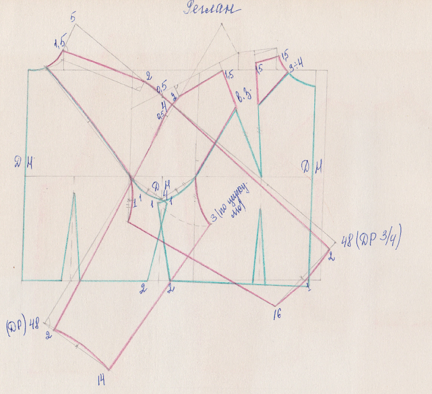 Я вот не люблю втачивать рукава, почему-то у меня это самая проблематичная часть при шитье. Возможно, это связано с тем, что шью я редко, в основном себе, еще реже могу сшить кому-то из подруг. И в таком случае очень выручает рукав реглан. В этом случае тоже возникает проблема: я очень не люблю реглан, при котором не предусмотрен росток на спинку, т.е. перед и задняя часть одинаковы. Приходится пользоваться выкройкой реглана на основе платья или блузы: Раскладка переда и спинки реглана на ткани: Рукава реглана сшиваются по линии плеча и по длине рукава, поэтому выкраиваем 4 детали: Правда, такой способ не вшивать рукава, а обходиться регланом, мне далеко не всегда нравится, т.к. плечи покатые. В этом случае выручают так называемые "ложные" рукава: По двойной линии ткань сосбаривается до размера выреза I спереди и сшивается с этим вырезом, спинка собирается до размера II и также сшивается. На схеме блузы показано, как будет выглядеть этот ложный рукав (прошу прощения за кривой эскиз, н