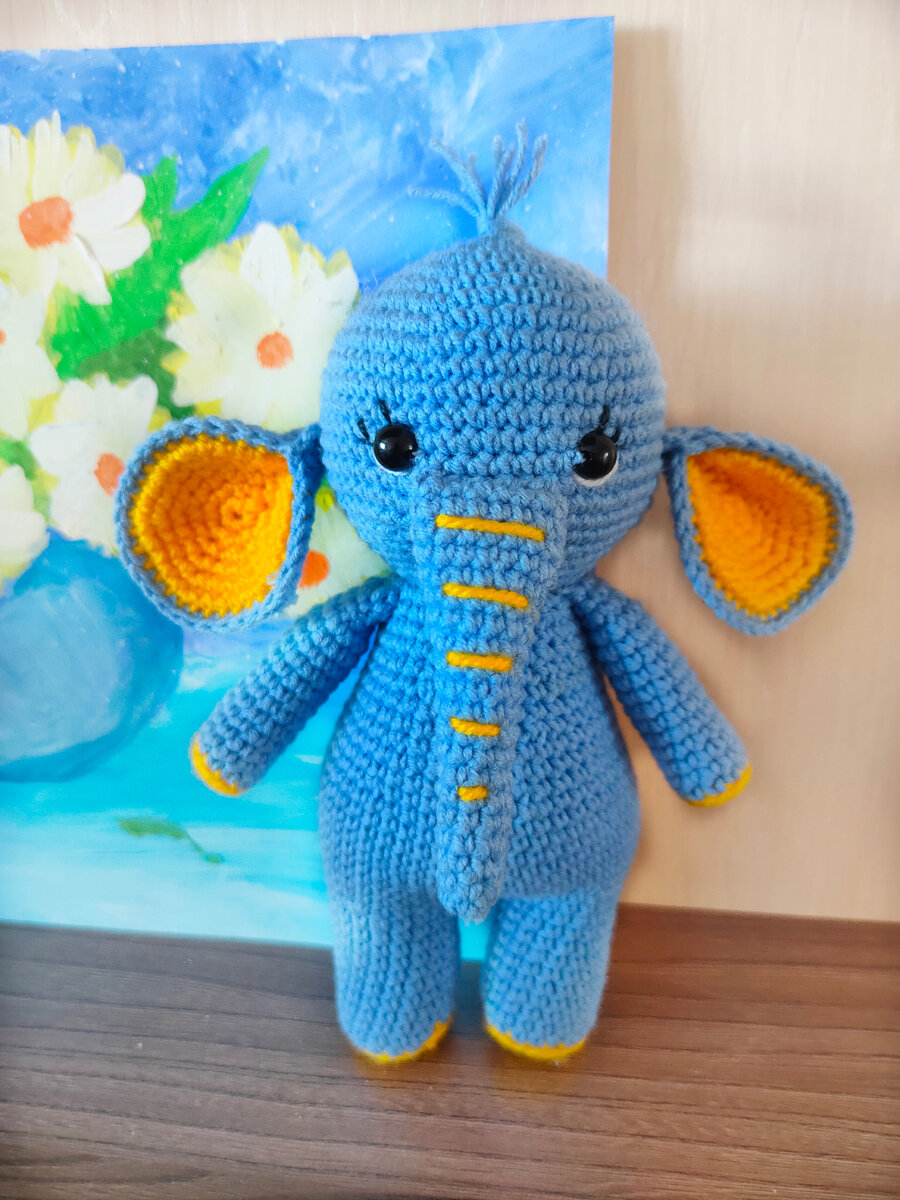 Всем Добрый день 🥰 Предлагаю связатьслоника по имени Яша. Не забудь подписаться поддержать автора своим лайком ♥️ Приятного вязания🧶🧶🧶 Нам понадобится: Пряжа yarnart jeans - цвет-16 синий, цвет-35 жёлтый Крючок: у меня 1,75мм Глазки:8мм Наполнитель для игрушек. Нить для вышивания ресничек у меня "ирис" МК слоник Яша Голова 1ряд- 6сбн в ка 2ряд- 6приб (12) 3ряд- (1сбн,пр)*6(18) 4ряд- (2сбн,пр)*6(24) 5ряд- (3сбн,пр)*6(30) 6ряд-(4сбн,пр)*6(36) 7ряд- (5сбн,пр)*6(42) 8ряд- (6сбн,пр)*6(48) 9ряд- (7сбн,пр)*6(54) 10-17ряд-54сбн (7 рядов) 18ряд- (7сбн,уб)*6(48) 19ряд- (6сбн,уб)*6(42) 20ряд- (5сбн,уб)*6(36) 21ряд- (4сбн,уб)*6(30) 22ряд- (3сбн,уб)*6(24) Ушки 4 детали- 2желтые и 2 синие детали 1ряд- 6 сбн 2ряд- приб 6 раз 3ряд- (1сбн,пр)*6(18) 4ряд- (2сбн,пр)*6(24) 5ряд- (3сбн,пр)*6(30) 6ряд- (4сбн,пр)*6(36) У детали жёлтого цвета завершите вязание сс, отрежет и спрячьте кончик нити. Обвязать жёлтое и синие детали по краю: (5сбн,пр)*6(42) Сложите ушко пополам и привязать вместе 4-5 столбиков