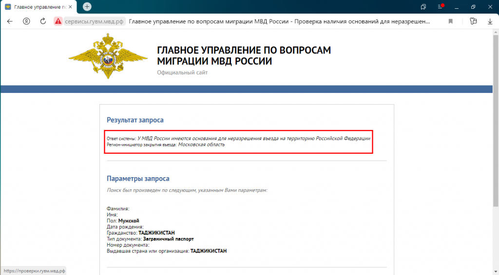 Три основных способа проверить запрет на въезд в РФ Первый способ. Онлайн через сайт МВД 3. Получаем результат, если у Вас есть запрет, об этом будет написано: Второй способ. Сходить в МФЦ Берем с собой паспорт, находим ближайшее отделение и приезжаем туда. Спросите на стойке информации как попасть к сотруднику паспортно-визовой службы. Специалист проверит базу данных и скажет есть ли у Вас запрет. Третий способ. Написать письмо в ГУ МВД России Проверить запрет на въезд в РФ этим способом сложно и долго. Плюс требуется нотариально заверенный перевод паспорта. Им лучше воспользоваться когда уже знаете что запрет точно есть и нужно выяснить причины и сроки. 1.Составляем заявление, ниже найдете образец Заявление-в-МВД 2.Нотариально заверяем перевод первой страницы паспорта 3.Отправляем заявление в ГУ МВД В случае наличия запрета вы получите подобный ответ: Этот способ дает самый точный ответ за что запрет, на какой срок, кем поставлен и многое другое.