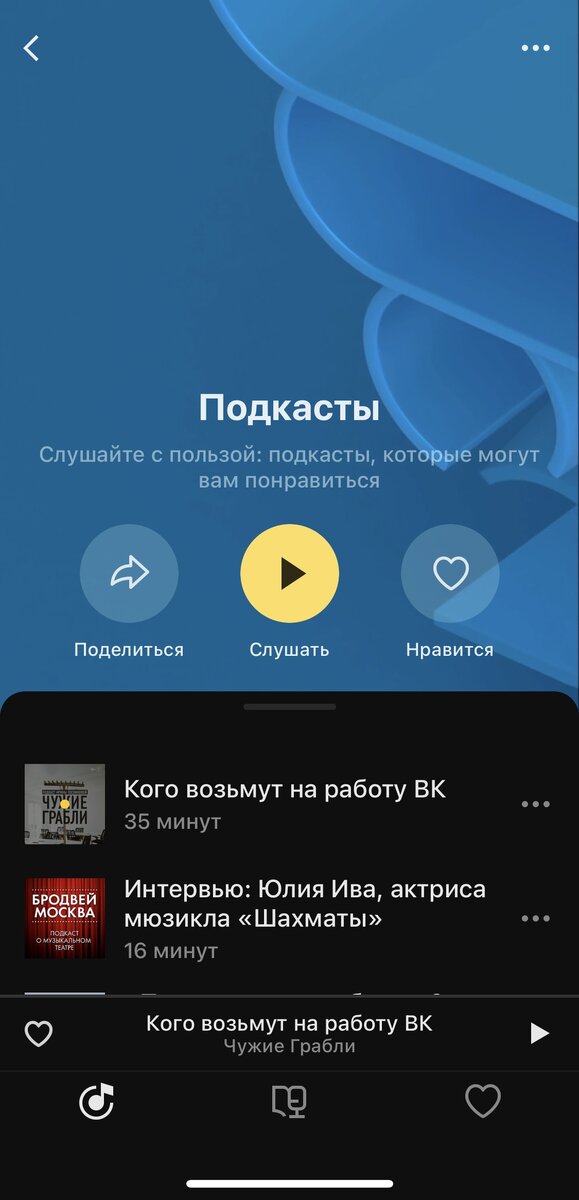 Ребята из Яндекс. Музыки заметили шестикратный прирост аудитории подкастов и решили активно развивать это направление. Теперь в приложении есть отдельный раздел с подкастами, чарты постоянно обновляются, независимые создатели могут продвигать свои проекты.
