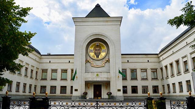 Данилов монастырь — продолжаем описание. На новом участке выстроена Резиденция Святейшего Патриарха Московского и всея Руси с храмом Всех Русских святых. Надкладезная часовня или, как называли ранее, Святой колодезь и Поминальная часовня. Храм Всех святых, в земле Русской просиявших. Храм Всех святых, в земле Русской просиявших, расположен в центре второго этажа Резиденции Святейшего Патриарха Московского и всея Руси. В 1983-1988-х в западной части монастыря была построена Резиденция Святейшего Патриарха Московского и всея Руси со служебными и парадными помещениями Священного синода и домовой церковью в честь Всех святых, в земле российской просиявших. Она имеет характерную для русского палатного и дворцового строительства композицию в виде буквы «Ш» в плане. Ярко выраженный современный вид фасадов скрашивают кровли с высокими коньками, резные белокаменные рельефы и мозаичный образ Спаса Нерукотворного, выполненный по мотивам знаменитой новгородской иконы Спасителя (мастер Е. Ключарёв