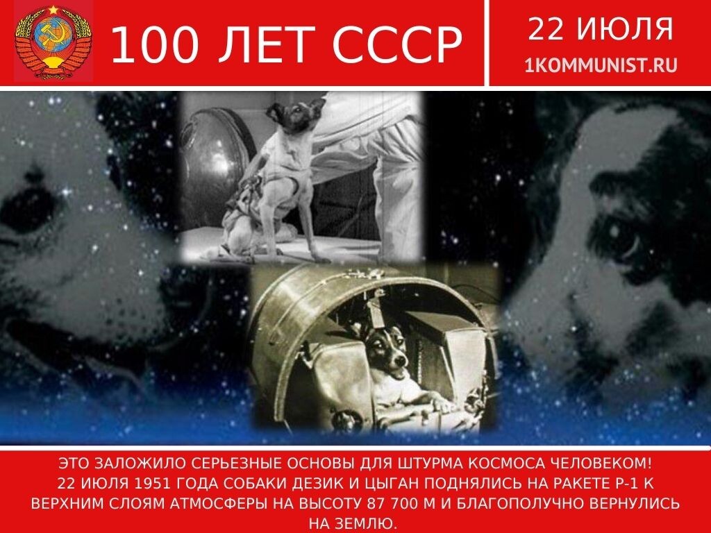 22 июля 1951 года собаки Дезик и Цыган поднялись на ракете Р1 к верхним слоям атмосферы на высоту 87 700 м и благополучно вернулись на Землю