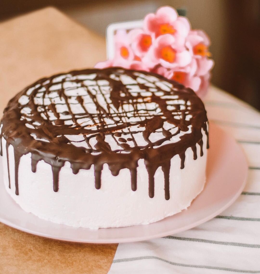 Готовый тортик переворачиваем на тарелку и покрываем растопленным шоколадом - покупным с хорошим составом или домашним, шоколадом на кэробе, а можно покрыть ганашем, чем вам больше нравится. Покрываю сеточкой, как на фото, так проще резать, шоколад не трескается.