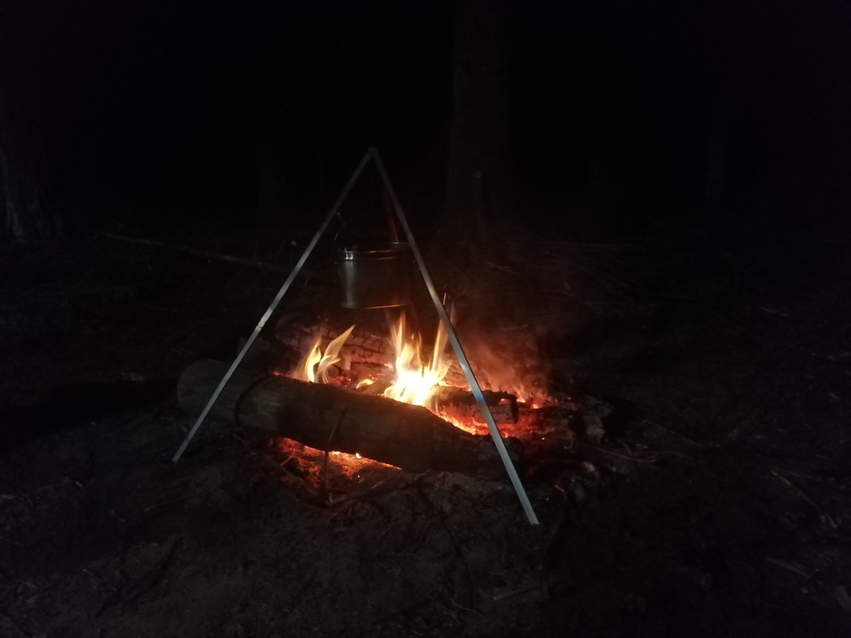 По задумке Друга система выглядела так – горит полинейзийский костёр, который даёт мало тепла вокруг, но оно плотно сконцентрировано в жерле костра. Над костром на треноге висит котелок.