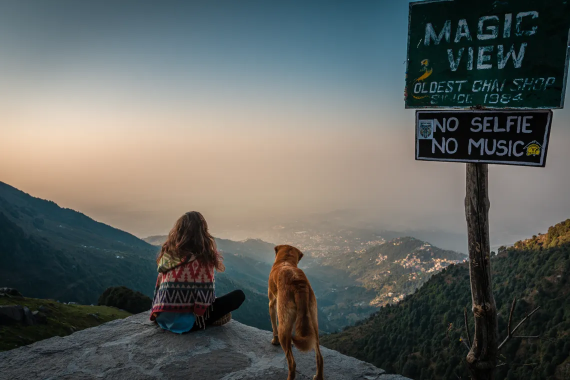 Я помню этот момент очень отчетливо. Я наслаждалась вкуснейшим чаем масала, любуясь невероятным пейзажем. Солнце начало подниматься и окрашивать небо красками различных оттенков (красные, желтые, оранжевые). И казалось, что собака тоже наслаждалась видами. У нас с ней получилась отличная фотография вместе.