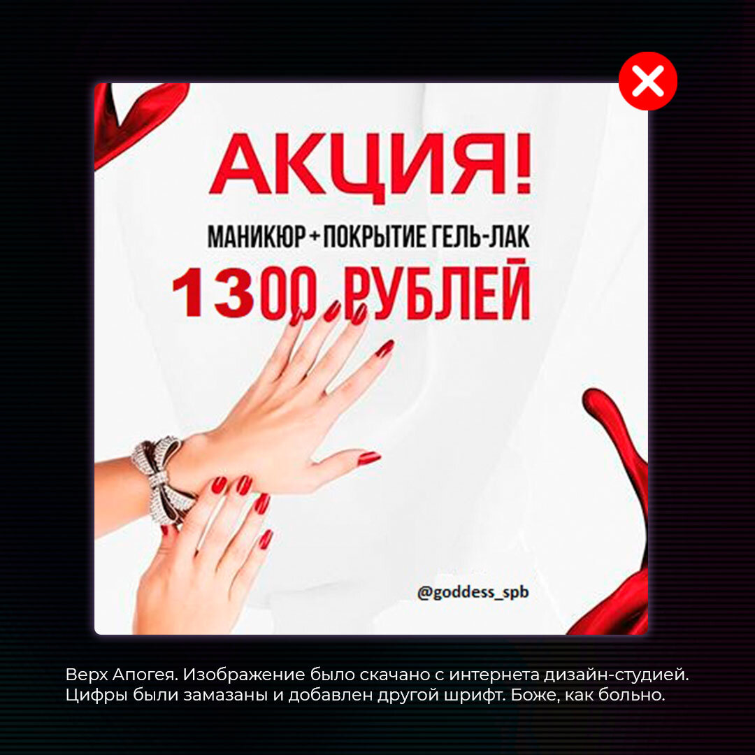 Мне часто бывает стыдно за коллег, которые делают работы абы как, лишь бы заработать (Испанский стыд). А особенно когда такие работы предлагают в своих рекламах и постах «псевдо-студии веб-дизайнерства» или «маркетологи со 100% результатом». Кстати, эти работы прислала моя клиентка, которая имела дело с очередными продвигаторами, которые за 2 месяца так и не разобрались как привлекать людей в салон красоты.