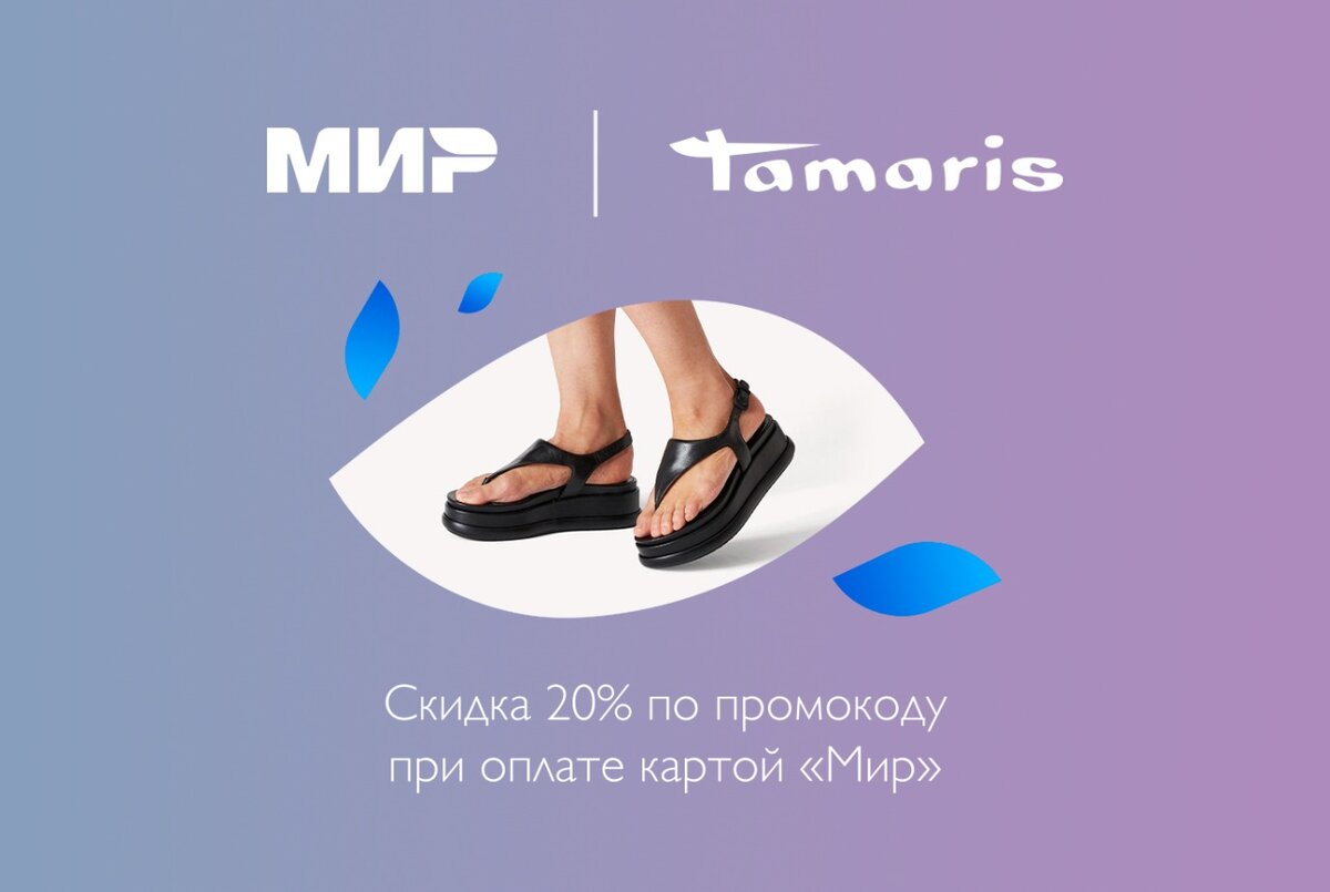 Обладатель банковской карты платежной системы "МИР"? Вам подарок от Tamaris! Правильная обувь и аксессуары для модного образа Tamaris теперь со скидкой 20% - для обладателей банковской карты платежной системы "МИР". До 8 августа получите промокод на сайте privetmir.ru и мобильном приложении "МИР" и укажите его при оформлении заказа в интернет-магазине tamaris.ru, оплатив покупку банковской картой платежной системы "МИР". Как получить промокод - читайте здесь Больше новинок в магазинах вашего города, в официальном интернет-магазине tamaris.ru и мобильном приложении.