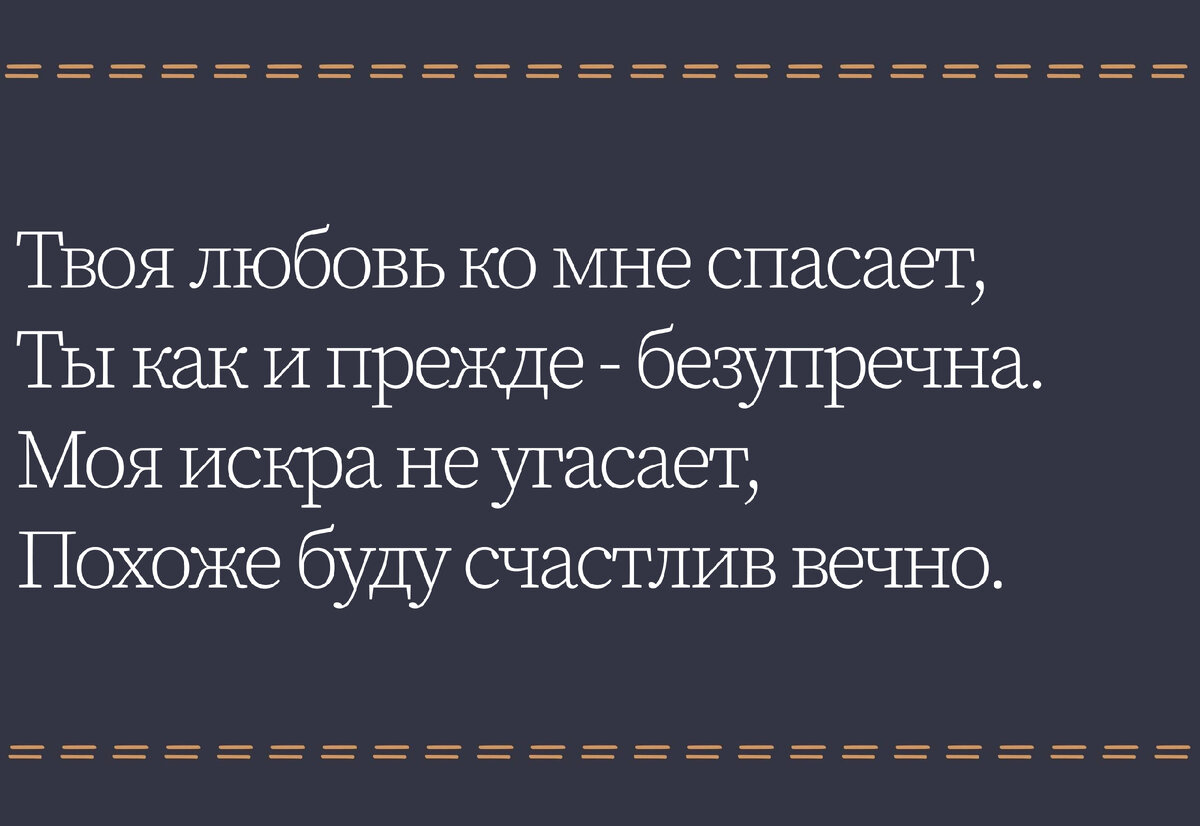 Твоя любовь ко мне спасает, Ты как и прежде - безупречна. Моя искра не угасает, Похоже буду счастлив вечно. Любовь к тебе подобна благодати, Что мне ниспослана с небес. Накладываю на себя печати, Чтобы не выбрался мой бес. Не существует рая или ада, Но все же соткан я из тьмы. Я вижу, ты как прежде рада, Как и ответы все твои - прямы. Но вдруг я все опять разрушу, Сжигая все, что будет на пути? Позволь спасти твою мне душу, Забудь меня, прости и отпусти.
