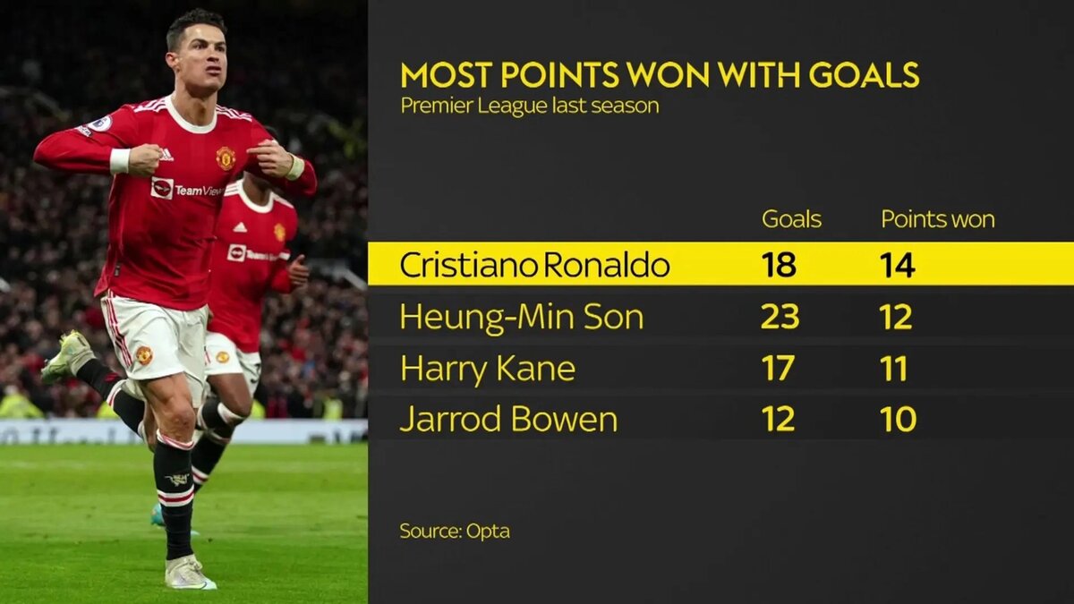 Роналду не только забивает много, его голы еще и приносят команде очки. Будущее Криштиану Роналду в « Манчестер Юнайтед» еще не определено - 37-летний футболист до сих пор не явился на предсезонный сбор команды. Согласно многочисленным сообщениям, португалец хочет покинуть клуб из-за участия в Лиге чемпионов и понижения его заработной платы. Тем не менее, очевидно, что «красные дьяволы» пожалеют, если позволят Роналду уйти этим летом, о чем говорит статистика. В прошлом сезоне Криштиану забил 18 голов в Премьер-лиге , что принесло «красным дьяволам» в общей сложности 14 очков — наибольшее количество очков, заработанных голами, среди всех игроков высшего дивизиона. Для примера, лучший бомбардир АПЛ кореец СОН забил на 5 мячей больше, но его голы принесли "шпорам" на 2 очка меньше.