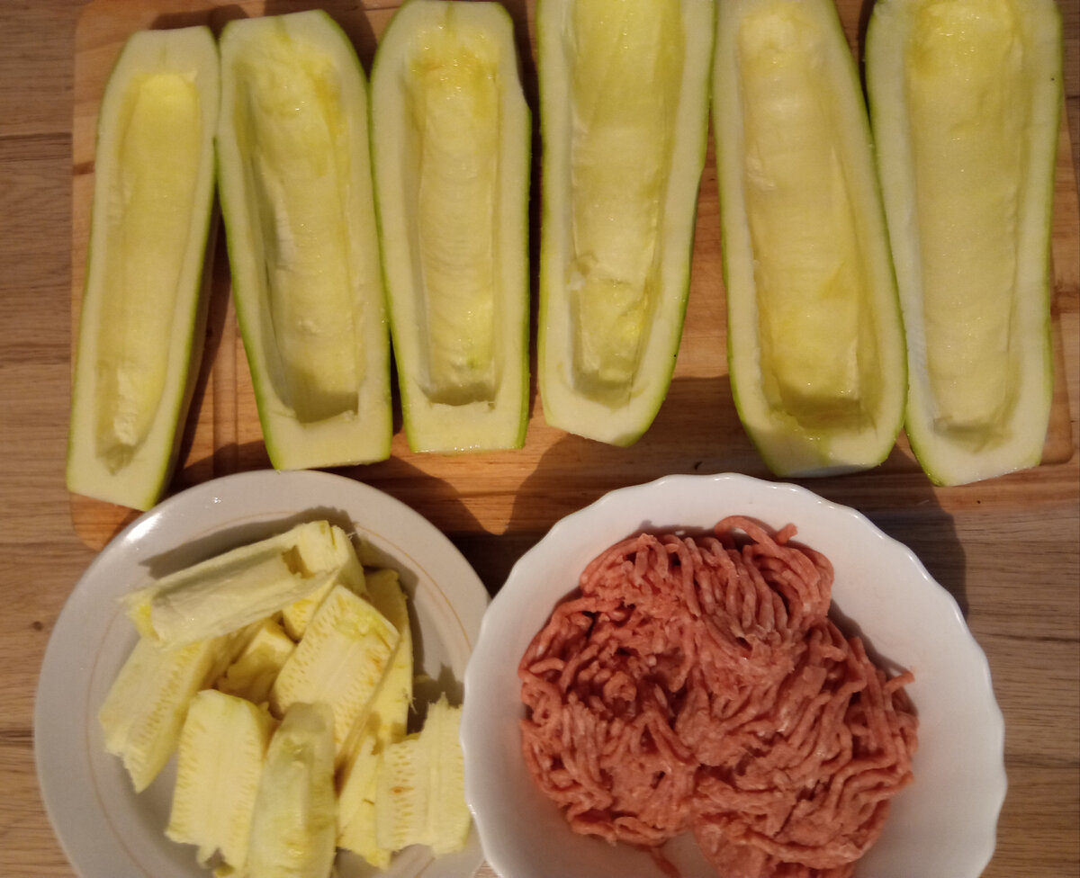 Доброго времени суток,дорогие читатели! Сегодня делюсь рецептом лодочек из кабачков.Это одно из моих любимых блюд. Начинку можно использовать самую разную. При желании можно добавить дополнительно овощи. В этот раз я готовила из базовых продуктов- кабачки,мясной фарш, сыр со сметаной. Я использовала фарш "домашний' из свинины и говядины. Одна такая фаршированная лодочка выходит на 320 ккал. Можно сделать более диетический вариант с фаршем из курицы или индейки. Сейчас самое время для этого лёгкого и вкусного блюда. Итак, для 6 лодочек нам потребуется: Если кабачки молодые, кожуру можно оставить. Разрезаем каждый кабачок вдоль на 2 одинаковые части. Вырезаем сердцевину. Мякоть не выбрасываем, она нам пригодится для начинки (без крупных косточек). Кабачки натираем со всех сторон солью, и начинаем готовить начинку. Мякоть измельчаем с помощью измельчителя или мясорубки и добавляем к мясному фаршу. Добавляем соль, перец и раскладываем по "лодочкам". Сыр натираем на крупной тëрке, смеш