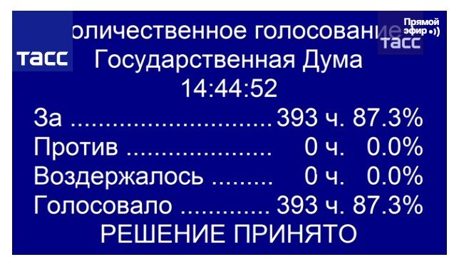 Народ, здравствуй. Пришла с работы, включила новости. Дума вначале одобряла Мантурова, тот в ответ благодарил каким-то голосом человека, имеющего проблемы со здоровьем, прежде всего, с верхними дыхательными путями (грипп, простуда, ангина). Правда, может, у него всегда такой осипший голос? Не знаю, в любом случае, здоровья человеку. Далее посмотрела еще чуть-чуть прямой эфир по ТАСС. Они там принимают законы (не разберешься, какие и зачем) сразу в нескольких чтениях и, естественно, в окончательном. Такого принтера мы еще не видели: сначала голосуют за 2 чтение, потом вопросов ни у кого нет, предлагают голосовать за 3-е чтение, и вуаля - закон принят. Картинка результатов одна и та же. Вот скан. По времени видите, что недавно приняли какой-то очередной закон. Что у них там дальше по повестке, не знаю и, в принципе, не хочу знать. Да там леший не разберется во всех законах, которые они за 5 минут принимают во всех чтениях. Думаю: стабильность. СМИ анонсировала еще и заседание Совбеза се
