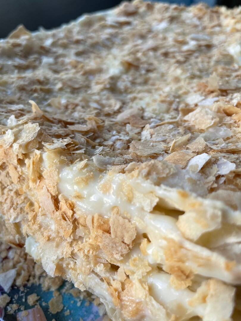 Торт «НАПОЛЕОН» который получится у всех,а Ваши гости будут в восторге. Ингредиенты: Молоко, Сгущенное молоко , Крахмал , Масло, Сахар , Яйца, Ванилин, Слоёное тесто Способ приготовления: Крем: В отдельной емкости смешиваем Молоко 250 мл Крахмал 75-80 гр Все развести в холодном молоке. Далее: Молоко 500 мл Сахар 100 гр (4ст/л) 6 яичных желтков Все смешать венчиком и довести до закипания. Затем потихоньку вливать ранее приготовленный крахмал с молоком, постоянно помешивая. Масса сразу начнёт густеть (По желанию можете добавить пакетик ванилина). Все охладить. В холодную массу вбить 250 гр сливочного масла +1 б сгущенного молока. 2 уп слоёного теста запечь в духовке. Выкладываем пласты теста на пергаментную бумагу. Отправляем их в разогретую до 200 градусов духовку. Выпекаем 15-20 минут (в зависимости от духовки). Следим, чтобы лепешки не подгорели. Разрезаем наши коржики острым ножом вдоль. Делаем это, пока они еще теплые, иначе потом разрезать тесто будет проблематично. Должно в итоге
