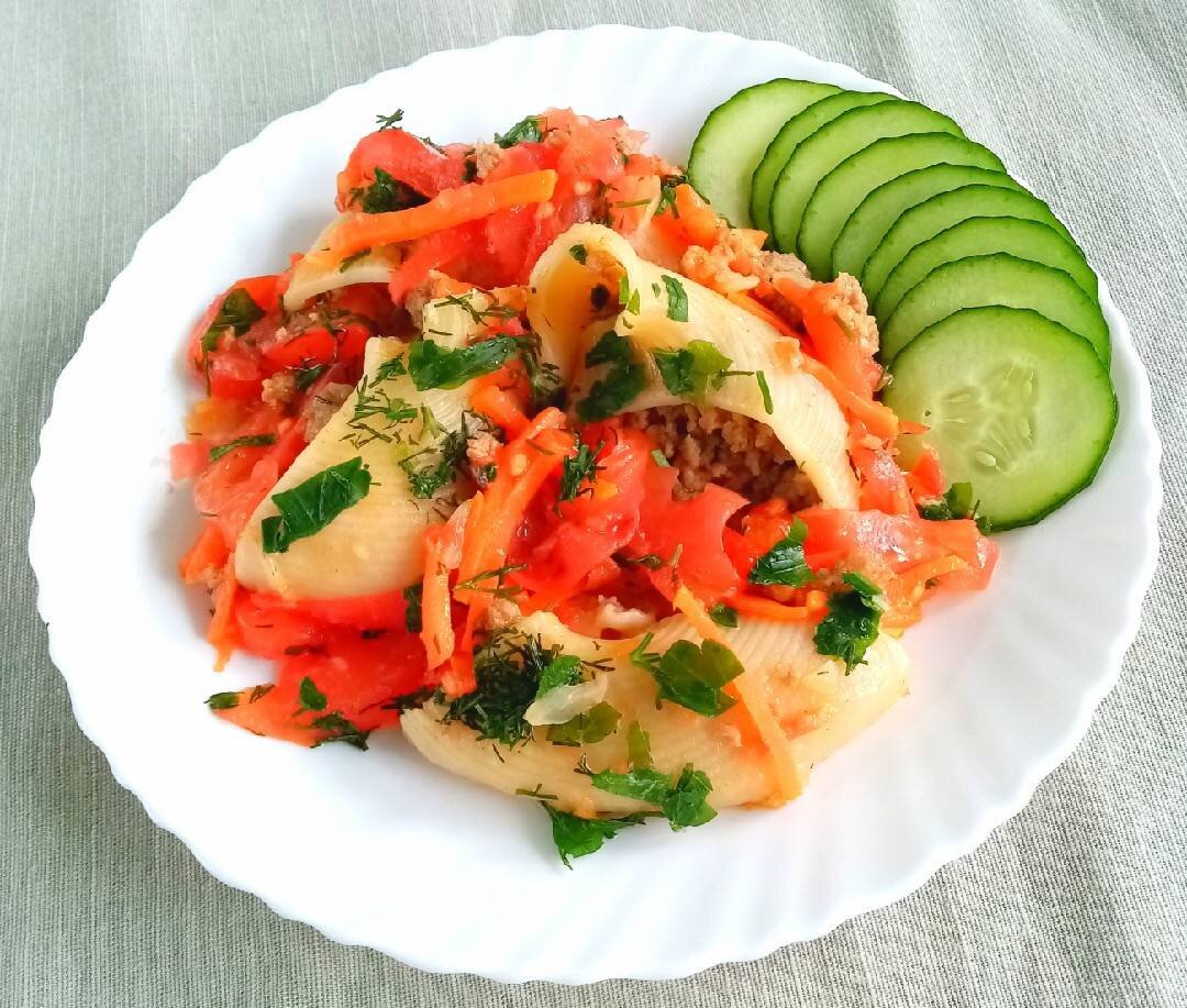 Ригатони - разновидность итальянских макаронных изделий, они гораздо крупнее обычных и их, как правило, фаршируют. Начинять можно чем угодно : рикоттой, баклажанами, мясом. Это блюдо настолько самодостаточное, что не нуждается ни в каком соусе или гарнире! #среда #ригатони #кукпадготовит Ингредиенты: ригатони, любого фарша, у меня свинина + говядина, луковицы, морковь, помидор, воды, соль и специи, растительное масло для жарки, зелень петрушки и укропа Способ приготовления: Отварить в подсоленной воде до полуготовности ригатони, промыть холодной водой. Луковицу мелко порезать, обжарить на растительном масле до мягкости. Добавить к луку фарш, жарить до полуготовности минут 5. Посолить, перемешать, дать немного остыть. Заполнить фаршем ригатони, выложить в глубокую форму, у меня сковорода. В сковороде, где жарили фарш, сделать зажарку из лука, моркови и помидора. Посолить по вкусу, добавить любимые специи, я добавила итальянские травы. Выложить зажарку в ригатони с фаршем, между ними и с