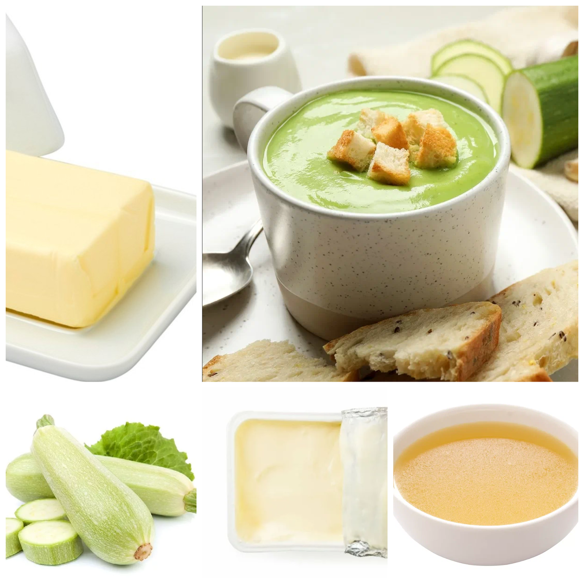Продукты: Кабачок - 1 шт. Куриный бульон - 1 стакан Сыр плавленый сливочный - 35 г Масло сливочное - 50 г Соль - 1 щепотка Шаг 1 Кабачок мелко нарезаем. Шаг2 В сотейнике топим сливочное масло. Шаг 3 В масло выкладываем нарезанный кабачок. Обжариваем, помешивая, на среднем огне 4 минуты. Шаг 4 Вливаем бульон. И варим 15 минут. Шаг 5 Затем перекладываем кабачки и бульон в блендер, добавляем сыр, солим и взбиваем до однородности. Подаем кабачковый крем-суп горячим с гренками или сухариками. Приятного аппетита. Посмотрите также видео рецепт Крем-супа из брокколи.