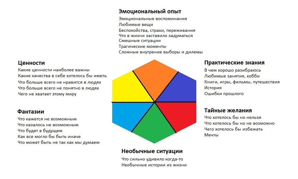 Создать интересную тему поможет колесо вопросов, разделенное на 6 областей. Задавая себе эти вопросы и придумывая новые, можно найти оригинальные идеи.