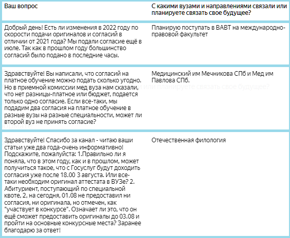 Разбираю ваши вопросы за 1 августа. Вот они: Вопрос: Здравствуйте! Спасибо за канал - читаю ваши статьи уже два года-очень информативно! Подскажите, пожалуйста: 1. Правильно ли я поняла, что в этом году, как и в прошлом, может получиться такое, что с Госуслуг будут доходить согласия уже после 18.00 3 августа. Или все-таки необходим оригинал аттестата в ВУЗе? 2. Абитуриент, поступающий по специальной квоте, 2, на сегодня, 01.08 не предоставил ни согласия, ни оригинала, но отмечен, как "участвует в конкурсе". Означает ли это, что он ещё сможет предоставить оригиналы до 03.08 и пройти на основные конкурсные места? Заранее благодарю за ответ! Ответ: Здравствуйте. Спасибо за добрые слова, я очень рада :) Теперь - к вопросам. 1. Не берусь утверждать, ибо сюрпризы от ГУ в этом году сыплются так часто и такие неприятные, что хочется просто кричать "горшочек, не вари". Про необходимость аттестата рассказано вот здесь: 2. Да, может. Таковы особенности зачисления по спецквоте. Подробнее - здесь: