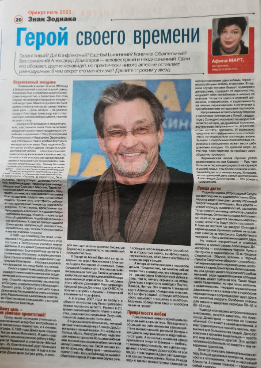 Напряженные аспекты между Марсом и Светилами (оппозиция с Луной, квадратура с Солнцем) добавляет «дегтя» в характер: душевные волнения, терзания, внутреннюю напряженность, агрессию, страх отстать, опоздать, постоянные колебания настроения. И, возможно, предполагает придирчивость к потенциальным партнершам. В отношениях может вести себя довольно холодно и дистанционно, пока не протестирует человека на интеллект и физическую чистоплотность. По указанию кармической линии Лунных Узлов (Козерог-Рак) , чем больше будет концентрироваться на карьере, в ущерб семье, тем более неустойчивой будет личная жизнь. И, похоже, что самый долгий его роман Александра Домогарова – это роман с профессией.