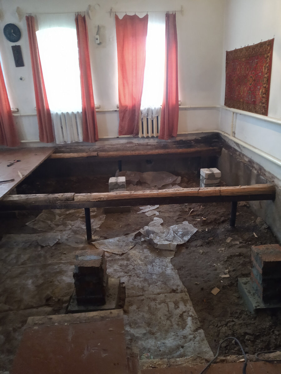 Привет друзья. Пол в комнате сделан по тому же принципу, что и в санузле, НО. Это самое но, выражается в том, что на ширину комнаты в почти 5 метров лаг всего три штуки. Из-за этого пол местами хорошо играет. Ну и конечно ко всему прочему перепады горизонта достигают 7ми сантиметров. Поэтому было принято волевое решение срывать пол, добавлять ещё две лаги и всё ровнять максимально в уровень. Продавец оставил нам кое-какую мебель и выносить её особо некуда, а помещение освобождать надо. По-этому всё будет ездить из угла в угол. Пол разобран Столбики я выложил заранее, ползал под полом, чтобы долго пол не был разобранным. Когда разобрал пол, просто выровнял их по высоте и на следующий день начал укладывать лаги и собирать. Заносил брус через окно с улицы, так как во дворе не развернешься. Уложил брус и два часа всё это выводил в относительный ноль. Доску укладывал старую. Она оказалась в нормальном состоянии, так что решил сэкономить. Получился вот такой перепад основной части по