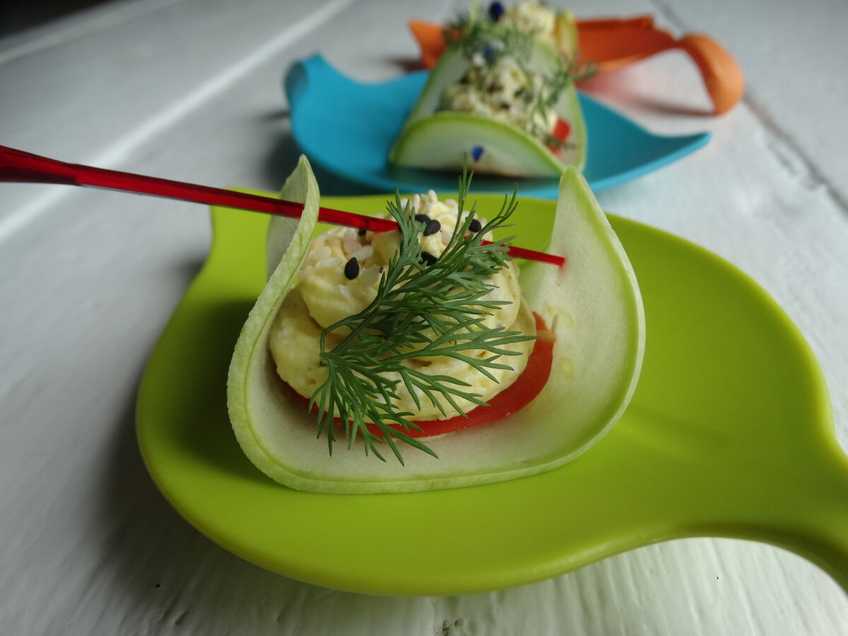 Когда-то я глубоко ошибалась, думая, что красивую закуску нужно делать исключительно для праздничного стола. Прошло время, и мне захотелось кормить мою семью не только вкусными, но и полезными, и даже красивыми блюдами. Оказалось, что совсем не сложно приготовить что-то эдакое для своих любимых. А когда семья сытая и довольная, то и я счастливая. Именно поэтому в мое домашнее меню вошли такие блюда, как фуршетные закуски. Делаются они маленькими, на один укус, но вид имеют всегда праздничный. Чем интересен этот рецепт? В основе закуски свежий кабачок. Его серьезно не воспринимают многие. Считают, что этот овощ обязательно нужно жарить, парить, варить и запекать. Но я уверена, что вкуснее сырого кабачка сложно представить овощ. Кабачок и сочный, и сладковатый, и хрустящий. Он просто идеален для вкусной закуски. Ингредиенты: · Кабачок – 1шт.; · Сырок плавленый – 1шт.; · Яйца – 2шт.; · Чеснок – 2зуб.; · Помидоры – 3шт.; · Зелень – маленький пучок; · Кунжут – 1ч.л.; · Майонез – 1,5ч.л.;