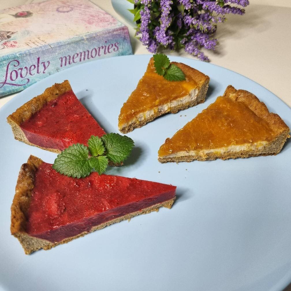 Сама не люблю долгие рецепты, хочется проще, но скажу вам здесь текста много ,а готовятся они достаточно быстро. Теста получилось много и я разделила их на 2 разных тарта, каждый по своему вкусен, начинки можно менять по своему вкусу, всем больше понравился абрикосово - ореховый, а по мне так и клубничный очень яркий на вкус. Пробуйте и делитесь своими вкусами🤗 #пирог #клубника #абрикос #миндаль #тарт #пп #веган #завтрак #десерт #ппдесерт #вкусно Ингредиенты: Рисовая мука , Нутовая мука, Кукурузная мука, Сода, Яблочный уксус , Подсластитель, Соль, Абрикосовое или яблочное пюре, Кокосовое масло, Семена льна + вода 45 мл, Начинка клубничная, Клубника мороженая , Агар-агар, Подсластитель , Начинка абрикосово ореховая, Миндаль , Вода, Абрикосовое пюре, Агар-агар , Подсластитель Способ приготовления: Семена льна перемолоть и залить водой, в блендер отправляем, фруктовое пюре, масло, уксус, и замоченные семена льна, все взбиваем блендером до единой массы. Смешиваем муку, подсластитель, соду