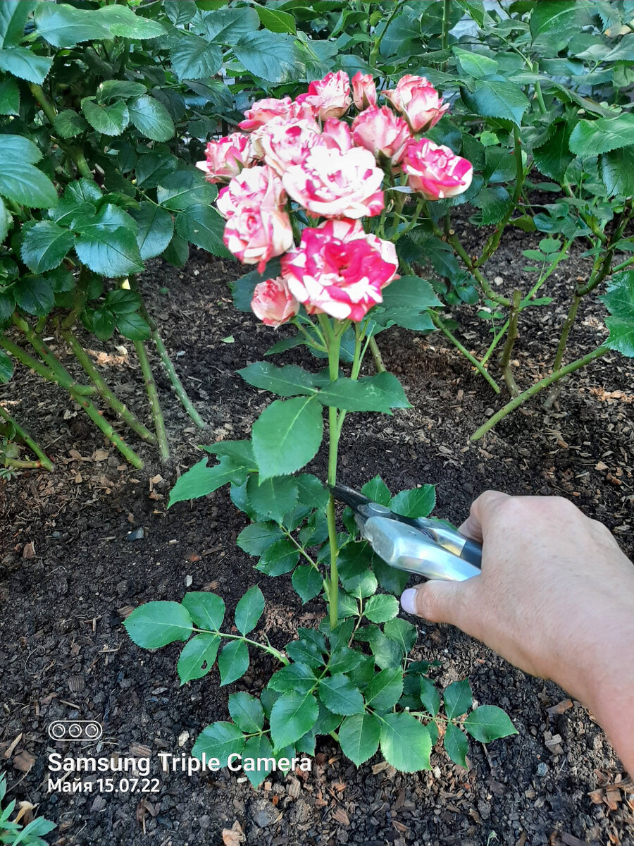 Я обещала рассказать и показать об обрезке роз после цветения своим читателям и мне хотелось накопить побольше для вас фотографий реальной обрезки, а не пересказывать книжную теорию. Розы патио, чайно-гибридные, флорибунда, розы Остина, шрабы я обрезаю все по одному принципу - срезаю примерно треть побега. При летней обрезке мы формируем здоровый и красивый куст, а не только удаляем отцветшие соцветия. Если обрезать очень низко - роза будет долго наращивать побег и вторая волна цветения может затянуться. При высокой обрезке мы можем получить слишком высокие кусты. Со временем вы набъёте руку и будете понимать с полувзгляда, как и где резать, а пока даю много примеров. Всю обрезку я делаю на внешнюю почку и к каждому кусту индивидуальный подход. Маленькие и слабые розы, а также розы этого года посадки очень коротко не режем. Ищем первую почку, направленную в нужную нам сторону, наружу, а не внутрь куста и обрезаем всё соцветие сразу. Обрезка флорибунды Angela. Если побеги были очен
