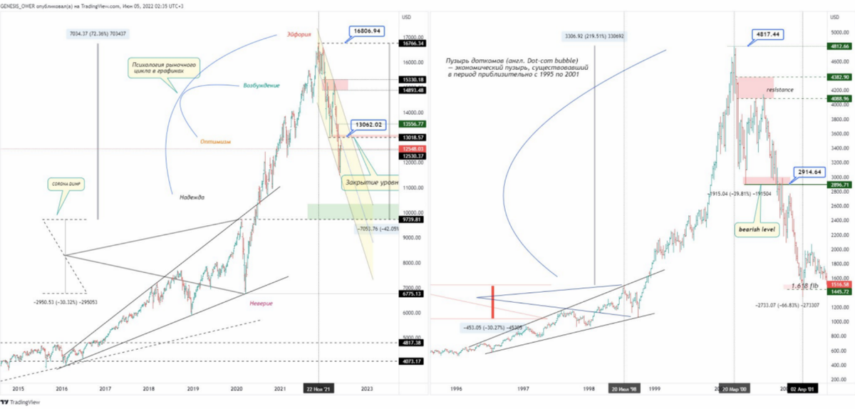 Это техническое сравнение двух кризисов: кризиса доткомов(1995-2001) и нынешнего, который разворачивается прямо сейчас.(Есть замечательный товарищ Ридван, огромное спасибо ему за визуализацию).Технически индексу Насдак есть куда еще падать. Если ФРС вновь не начнет количественное смягчение в связи с угрозой разрушения долгового рынка США, то падение индекса продолжится. Ставки по трежерис глубоко отрицательные даже при «приукрашенной» официальной долларовой инфляции в 9,1% годовых. Пока ФРС удается неформальными методами сдерживать эту огромную денежную массу. Но долго это продолжаться это не может. Возможно это и является основной движущей силой для эскалации конфликта внутри Европы. ФРС нужно бегство европейского капитала для поддержания стабильности долларовой системы. Мне интересно о чем думают реальные хозяева Европы. Вслед за бегством капитала придут социальные волнения, огромная инфляция, которая уничтожит «бумажные» активы нынешней политической элиты Европы, остановит мно