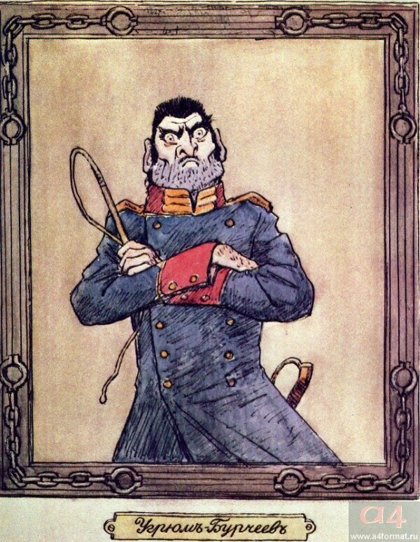 Николай I, согласно свидетельствам своих современников, мало интересовался гуманитарными науками, а также родами деятельности, которые так необходимы государю, экономикой, философией и пр. Из-за огромной разницы в возрасте с старшими братьями, Александром и Константином, при дворе его не рассматривали в качестве возможного будущего императора; Николая Павловича не подпускали к делам государственной важности. В таких случаях великим князьям достаётся свой малый удел - гвардия. Как только Николай I стал командиром бригады, он решил взяться за дисциплину в рядах армии. И прославился чередой скандалов, связанных с великокняжеской жестокостью по отношению к подчинённым. В "Истории одного города" М.Е.Салтыкова-Щедрина есть подобный сюжет. Прибыв в город, Угрюм-Бурчеев стал упражняться в введении дисциплинарных порядков, близких к абсурду, которые можно охарактеризовать одним словом - муштра. Безусловно, повествование приперчено гротеском и авторской иронией, это даёт полноту образа. Например, новоиспечённый градоначальник разделил семьи по возрасту и числу членов этой самой семьи: если у одной семьи шесть детей, а у другой четыре ребёнка, то необходимо забрать младенца из одной семьи и отдать другой - таков вердикт Угрюм-Бурчеева. В каждой семье нужно назначить шпиона, ответственного за наблюдение за должным исполнением распоряжений, а каждый вечер шпионы обязаны сдавать надлежащие рапорты начальству. В обычные дни, коих 363 в году, горожане работают с утра до вечера, а в праздничные даты, коих две, позволяется маршировать на плацу под личным командованием градоначальника. Автор отмечает любовь Угрюм-Бурчеева к проведению смотров и парадов. В свободное время он в одиночестве марширует на площади, притом добросовестно стегая себя кнутом. Стремление к армейской муштре присуще как литературному персонажу, так и русскому императору.