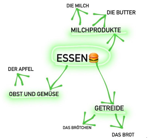 Одним из актуальных и удобных вариантов, даже на базовых уровнях изучения языка, на мой взгляд, является составление mindmap на самые различные темы. Что же такое mindmap? Это интеллект-карта, которая позволяет визуализировать и структурировать информацию для лучшего ее изучения и понимания, тем самым она упрощает работу с материалом, в нашем случае работу с усвоением новых лексических единиц или повторением уже пройденных. Вам целенаправленно стоит еще раз воспользоваться учебником, а именно оглавлением. Выберите любую из тем. Как правило, на уровнях А1-В1 эти темы одинаковые: семья, покупки, отдых, здоровье и так далее; После выбора темы, запишите ее по центру листа бумаги (например, «Семья»); Далее Вам необходимо написать вокруг выбранной темы все слова, которые вы уже знаете или учите на эту тему (Eltern, Kinder, Großeltern); На четвертом этапе рекомендую проверить артикли существительных, правописание слов и их формы по словарю (разумеется, если такая необходимость возникает); П