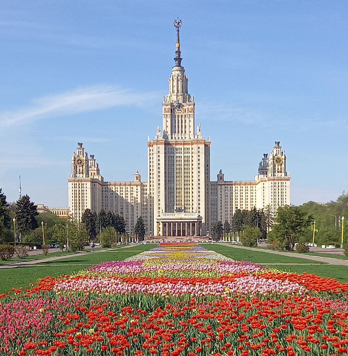 Ну, а вот и главный вид на Москву, который открывается с верхних этажей Главного здания. На переднем плане клумба, где цветами высажена дата основания Университета, 1755 год, далее Аллея ученых МГУ с фонтаном «Лилия», служащая ее продолжением «сакуровая» аллея и смотровая площадка вдалеке. К слову, единственный минус МГУ как смотровой площадки в том, что Главное здание расположено далековато от центра. Но, если как следует присмотреться, отсюда можно увидеть и Кремль с Собором Василия Блаженного, и Храм Христа Спасителя, и Останкинскую телебашню, и шесть других сталинских высоток Москвы, и много чего другого.
