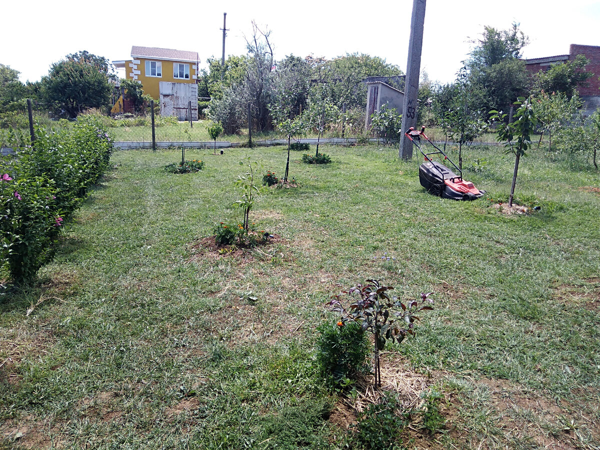 Хотите обновить свой сад и охнуть от восхищения? Подзапустите его, а потом покосите! Я такое иногда практикую ). Не преднамеренно конечно. Просто в последнее время ничего не успеваю. Лето - пора горячая во всех смыслах. Надо спасать сад и огород от засухи и сорняков. И ещё лето – пора гостей. Время утекает сквозь пальцы как вода. Покосить собиралась дней 10 назад. И вот наконец-то сподобилась. Ну и как всегда, после покоса, хожу наслаждаюсь картинкой. Во-первых, сразу «проявились» подрастающие вокруг деревьев бархатцы. На этом фото хорошо видно разницу между выкошенной и заросшей частью участка - на одной бархатцы растут, а на другой их как будто нет. Не зря я их редкие всходы самосева вылавливала по саду. Посаженные весной семена у меня не взошли. Так и не понимаю – почему. Вот так я недавно вычисляла и помечала камешками самосев для будущей пересадки. Теперь они растут, как и задумывалось - в приствольных кругах. Вот такое, например жабо у инжира. Моя крымская тайга после покоса к