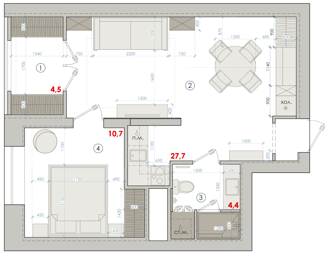 Наша героиня приобрела эту "однушку" в новостройке. И так как она хотела уместить здесь несколько функциональных зон, хозяйка сразу же обратилась за помощью к профессиональному дизайнеру. Проект Заказчица сразу озвучила свои основные пожелания: изолированная спальня, гардеробная и небольшая кухня, так как героиня немного готовит и большая кухня ей ни к чему. Прихожая Прихожая получилась совсем небольшая. Напольное покрытие выложено из мрамора, а стены выкрашены в серо-бежевом цвете. На входной двери расположилось зеркало. С левой стороны установили открытую вешалку для верхней одежды. Кухня Так как заказчица просила маленькую кухню, ее установили на территории коридора. Такая перепланировка полностью законная, так как оформляется как ниша. Мокрая зона осталась на прежнем месте. На полу выложили паркет. Фасады выполнили в насыщенном бордовом цвете. Столешницу и фартук сделали из мрамора. Гостиная При входе в гостиную расположилась большая буфетная зона, где находятся места для хранения.