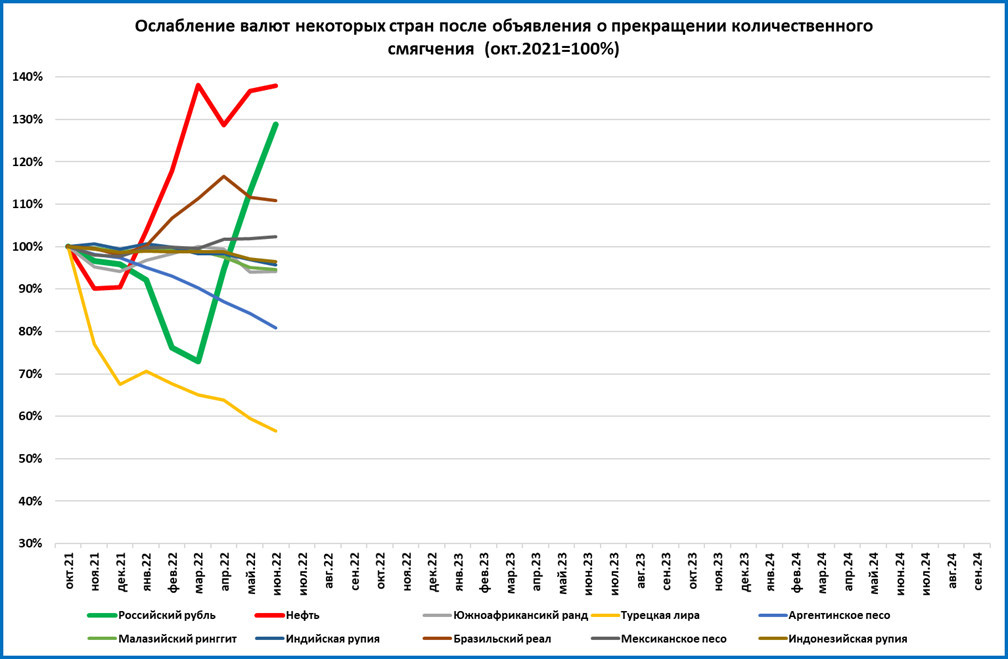 Но укрепление доллара касается большинства валют, а не только евро. В своих ежемесячных обзорах “быстрых” индикаторов мы отслеживаем динамику курсов некоторых валют и нефти по отношению к доллару.