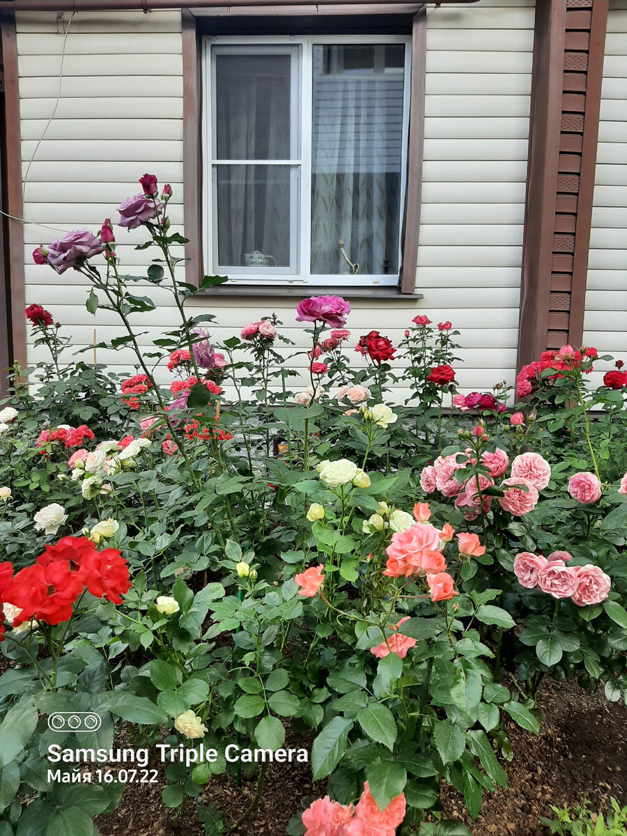 К середине лета обнаружились все пересорты и не совпадения по цвету, высоте, ширине и так далее. Пока розы подросли и процвели, либо продолжают цвести, мы хорошо видим, что сидит не на своём месте и мозолит нам глаза. Роза Минерва явно выбивается из общей картины своим непомерным ростом и просится на задний план куда-нибудь к забору. А вот это вообще не роза, я честно ждала красоты 3 года, но вижу только гору лепестков на листьях и на земле. Здесь без жалости и без вариантов. Пересортный полосатик занимает место благородной розы и никак не сочетается с красавицей Гейшей, тоже посадки этого года. Чиппендейл 3 года сидит на заднем плане, ему там явно не нравится, расти не хочет и его закрыли более высокие розы. Несколько дней я хожу и обдумываю пересадки, рассматриваю все варианты. Здесь не просто нужно посадить на новое место, у меня его нет, здесь именно нужно всё перетасовать так, чтобы вписать розы в существующий цветник. Когда в голове все пазлы сложились, я берусь за лопату.